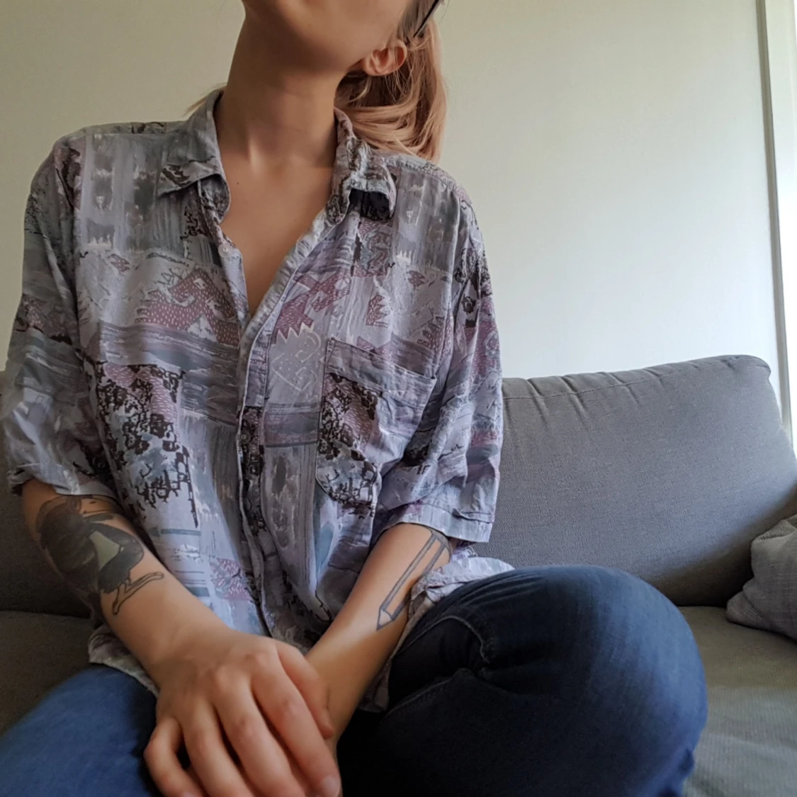 Mjukaste skjortan någonsin. Unikt mönster i mestadels blå/lila toner. Unisex. Sitter löst på en s och fitted på en L, så beror på hur man vill att den ska sitta :)