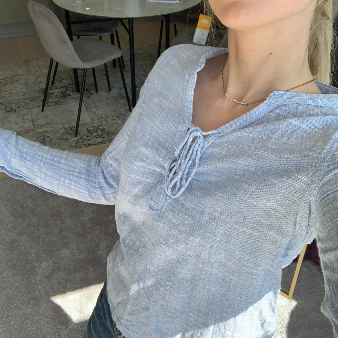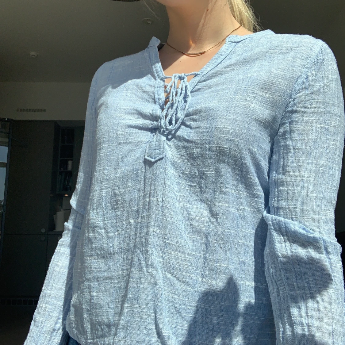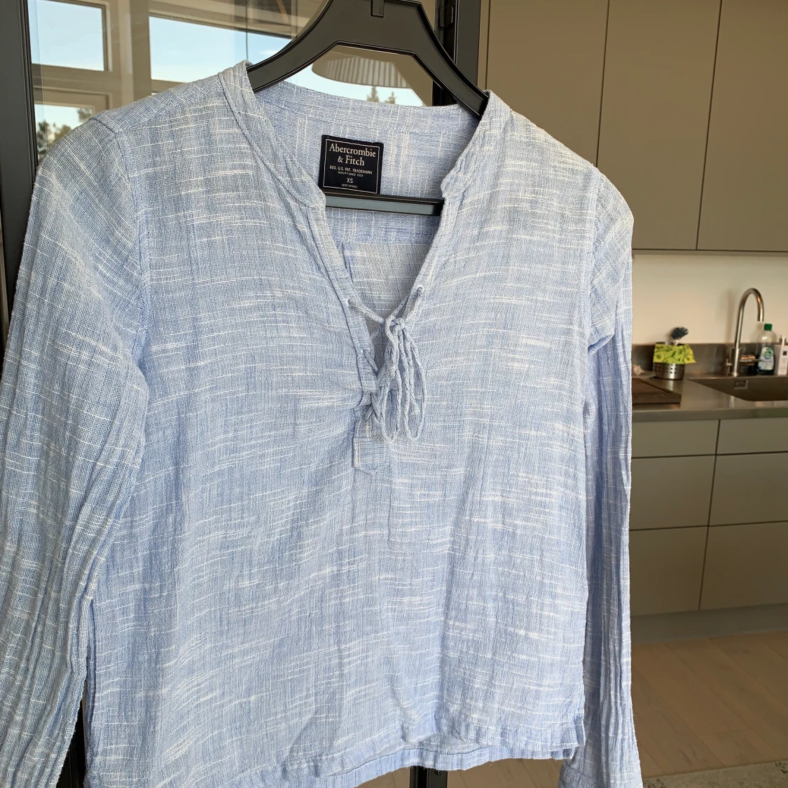 Linneaskjorta i fin blå färg från Abercrombie and Fitch. Ett antal år gammal men sparsamt använd, ser eller känns inte sliten! Knytning i urringningen.