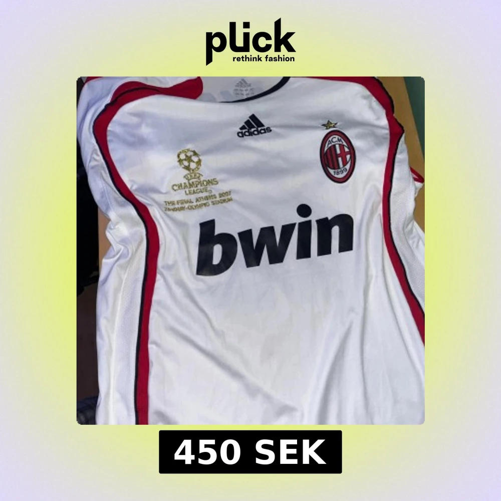 Säljer en officiell AC Milan fotbollströja från Champions League-finalen 2007 med Kaka och nummer 22 på ryggen. Tröjan är vit med röda och svarta detaljer, broderat guldmärke och klubbemblem. Tillverkad i lätt polyester, perfekt för fans och samlare.