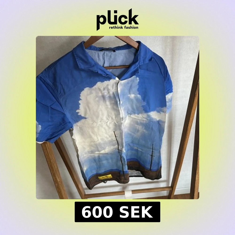 Säljer en unik blå skjorta från Axel Arigato med korta ärmar och tryck av moln och himmel.