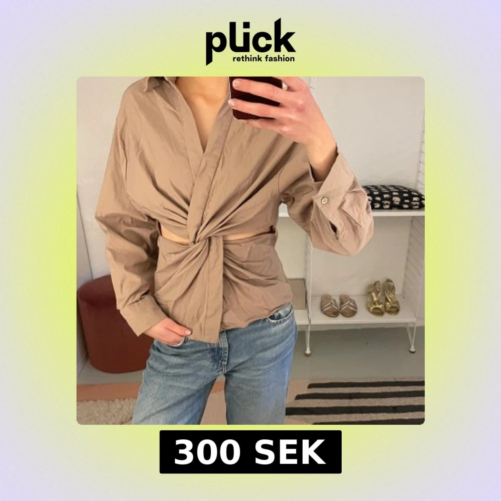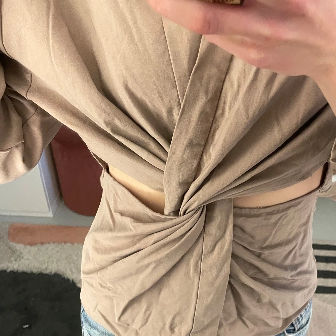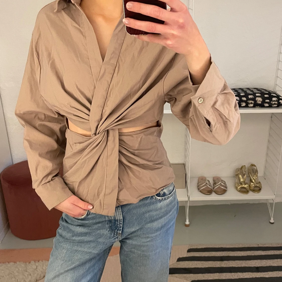 Trendig beige/brun skjorta i bomull med omlott och knyt framtill som ger en snygg cut-out effekt vid midjan. Skjortan har lång ärm, klassisk krage och knappar vid ärmslut. Perfekt för dig som vill ha en unik och stilren look.