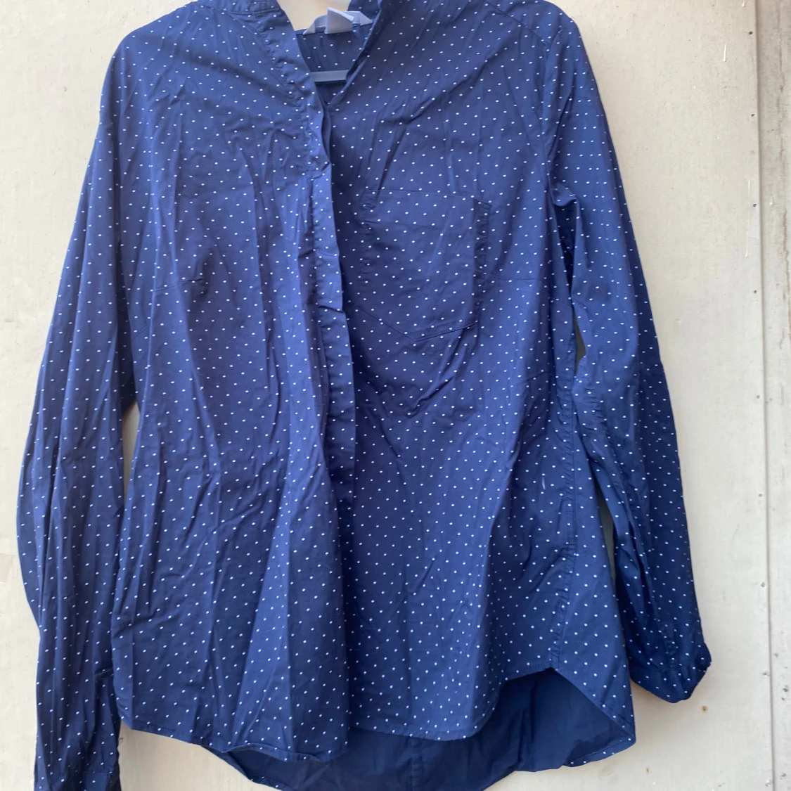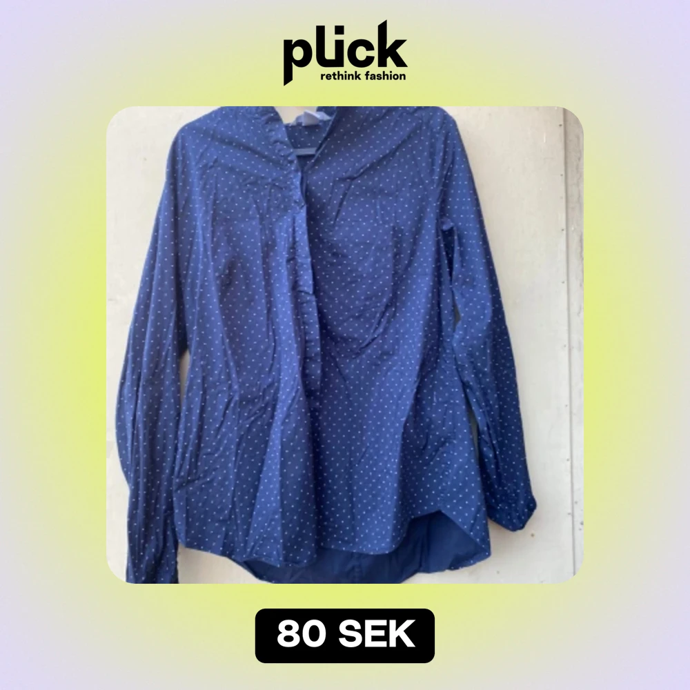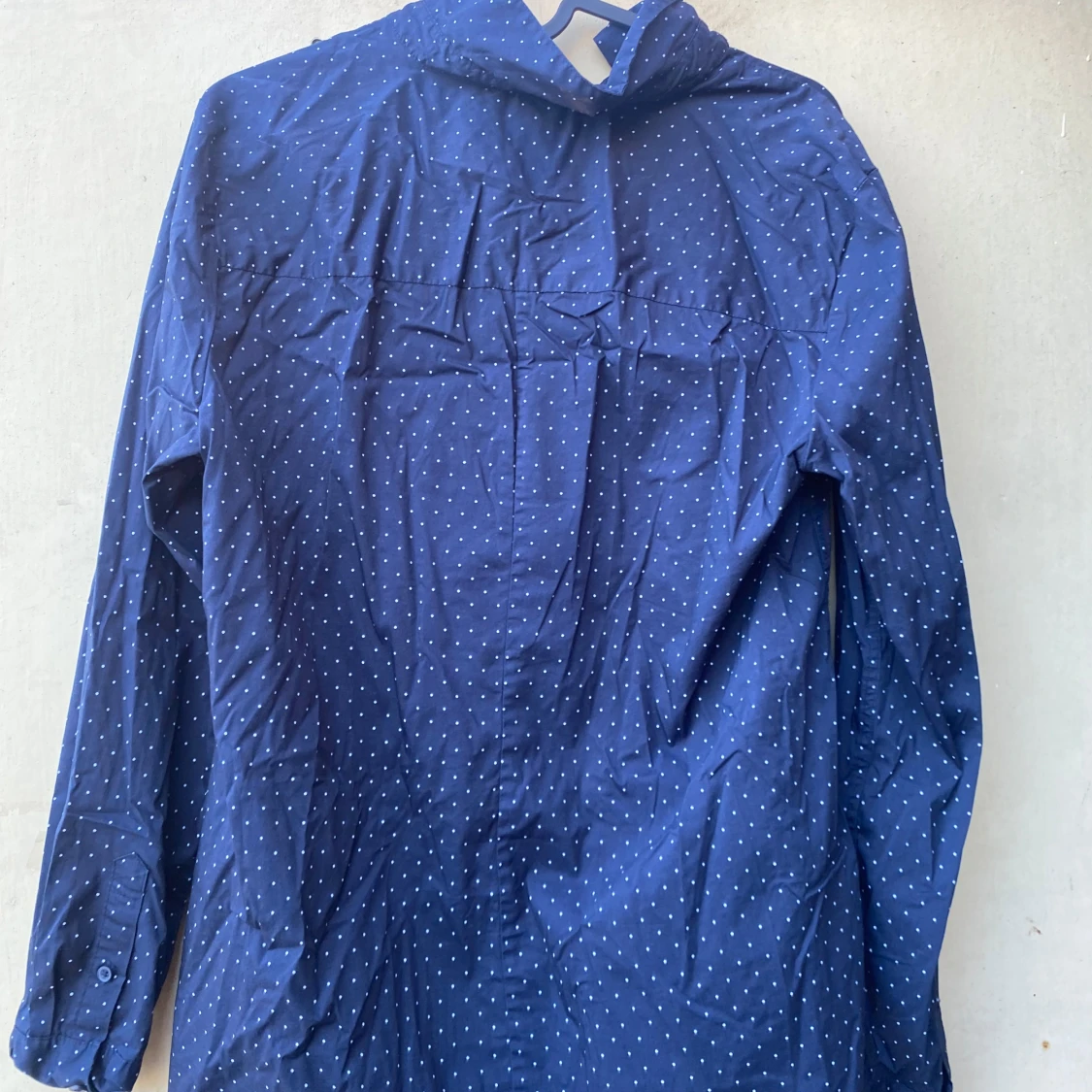 Säljer en snygg blå skjorta med vita prickar. Skjortan har långa ärmar och en klassisk krage. Perfekt för både vardag och fest! Den är i storlek L och i bra skick.