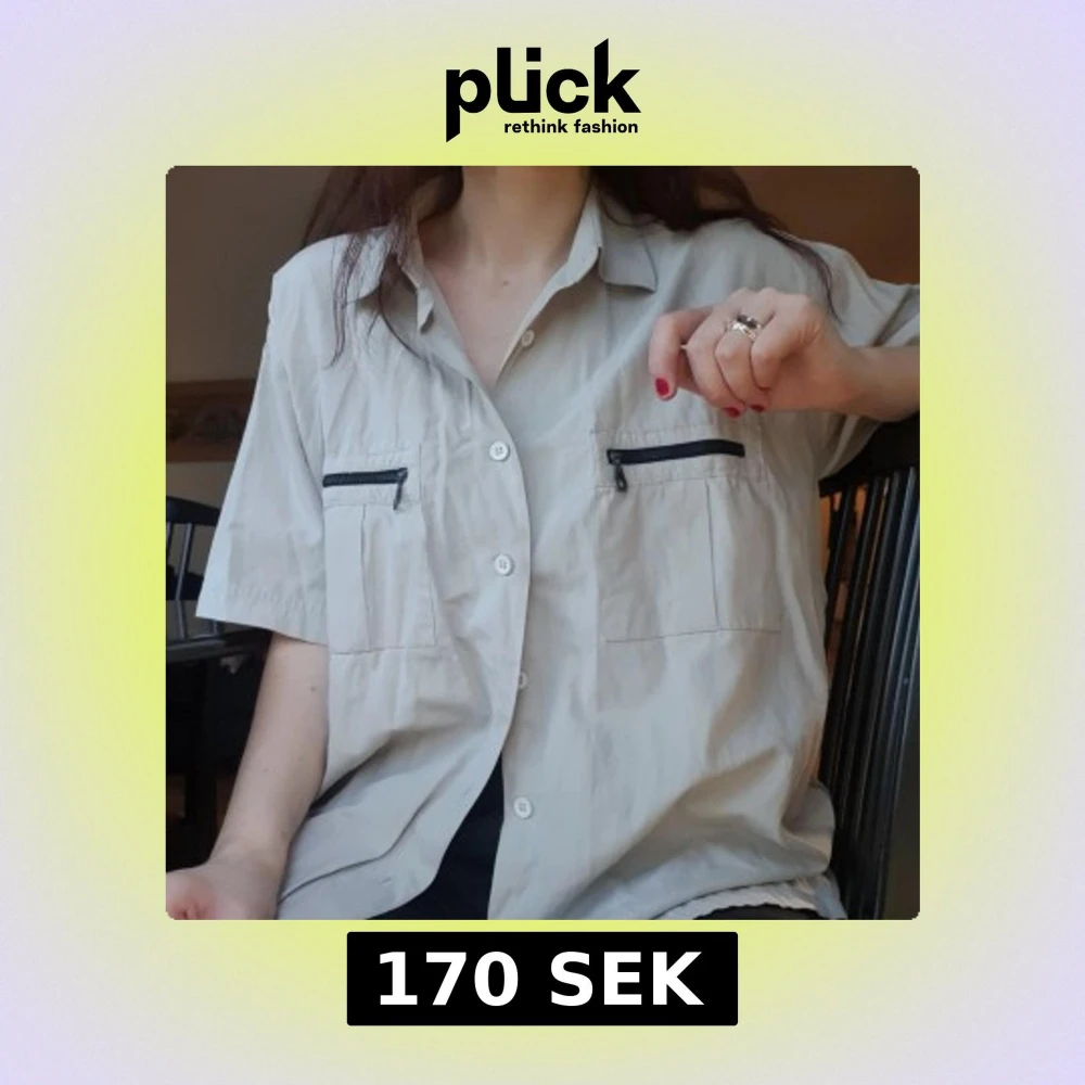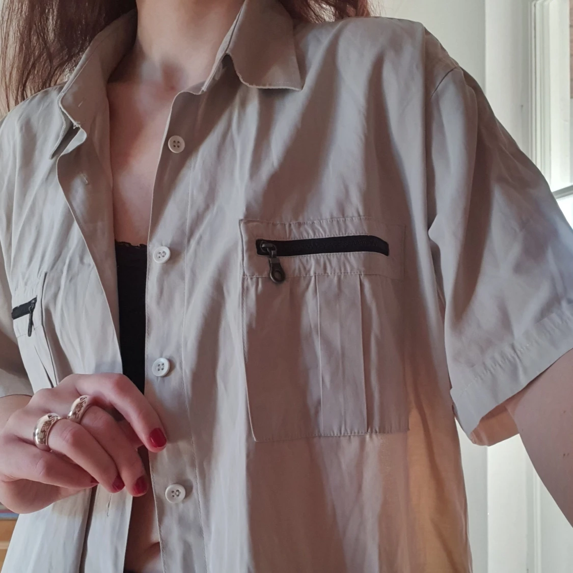 Beige skjorta med korta ärmar och avslappnad passform. Två bröstfickor med svarta dragkedjor ger lite utility-vibe. Skjortan har klassisk krage och knäppning framtill. Jag har vanligtvis storlek 36 och denna är som ni ser lös på mig. 💝