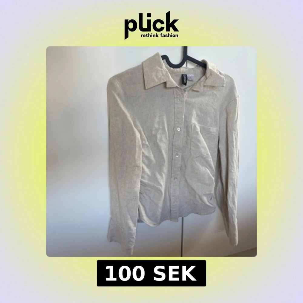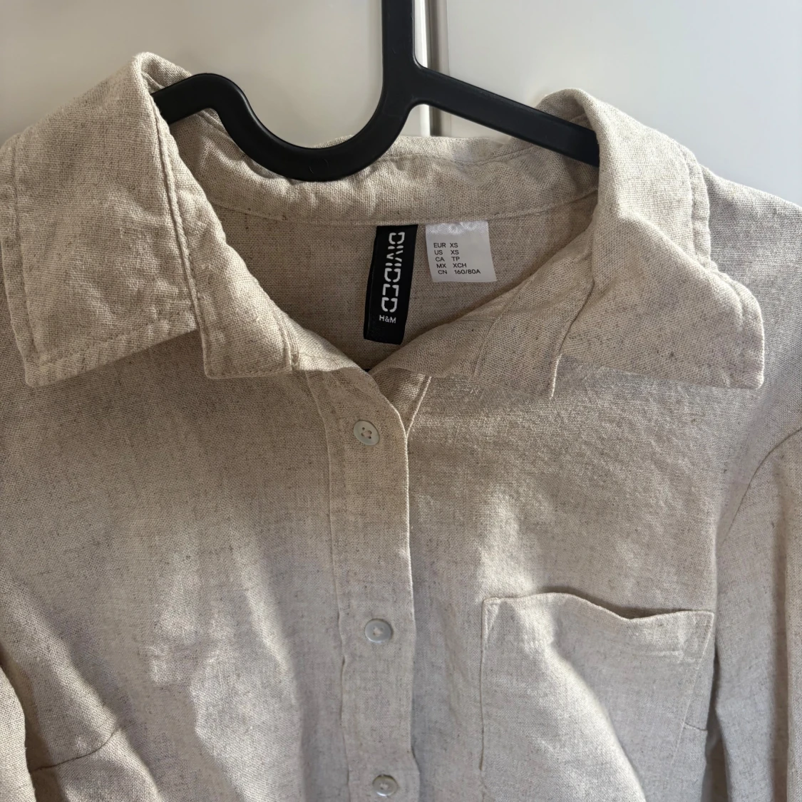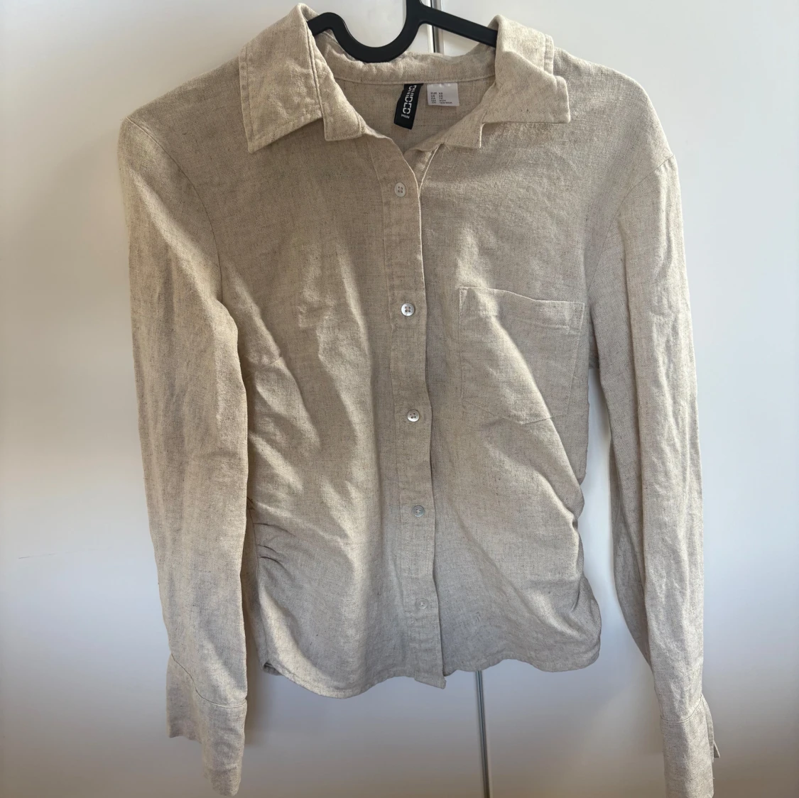 Snygg beige skjorta i linne från H&M med klassisk krage och bröstficka. Skjortan har långa ärmar och knäppning framtill samt indragen midja Perfekt för en stilren och avslappnad look. Helt oanvänd, endast testad