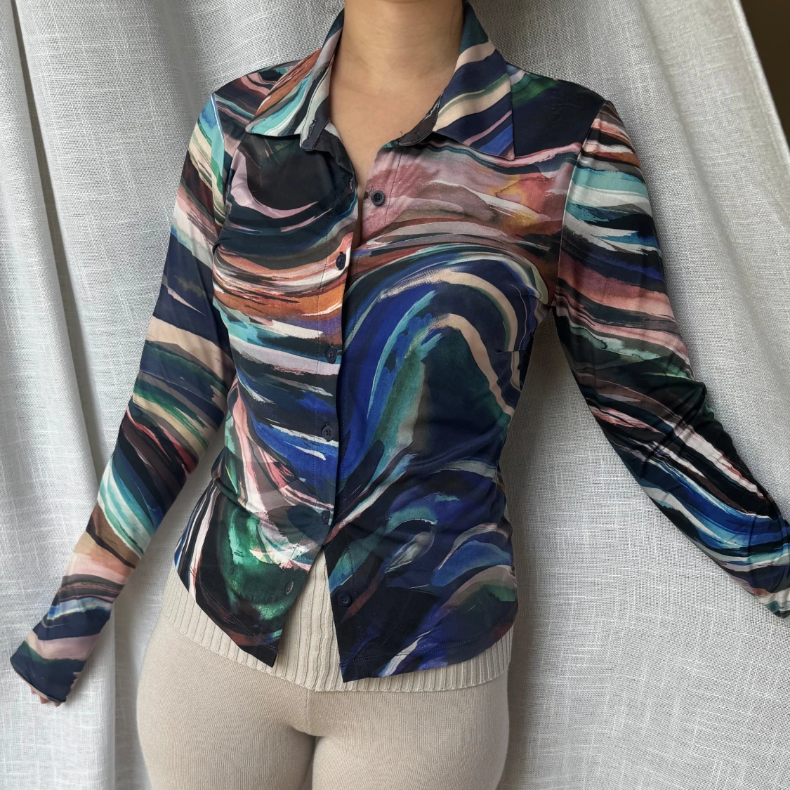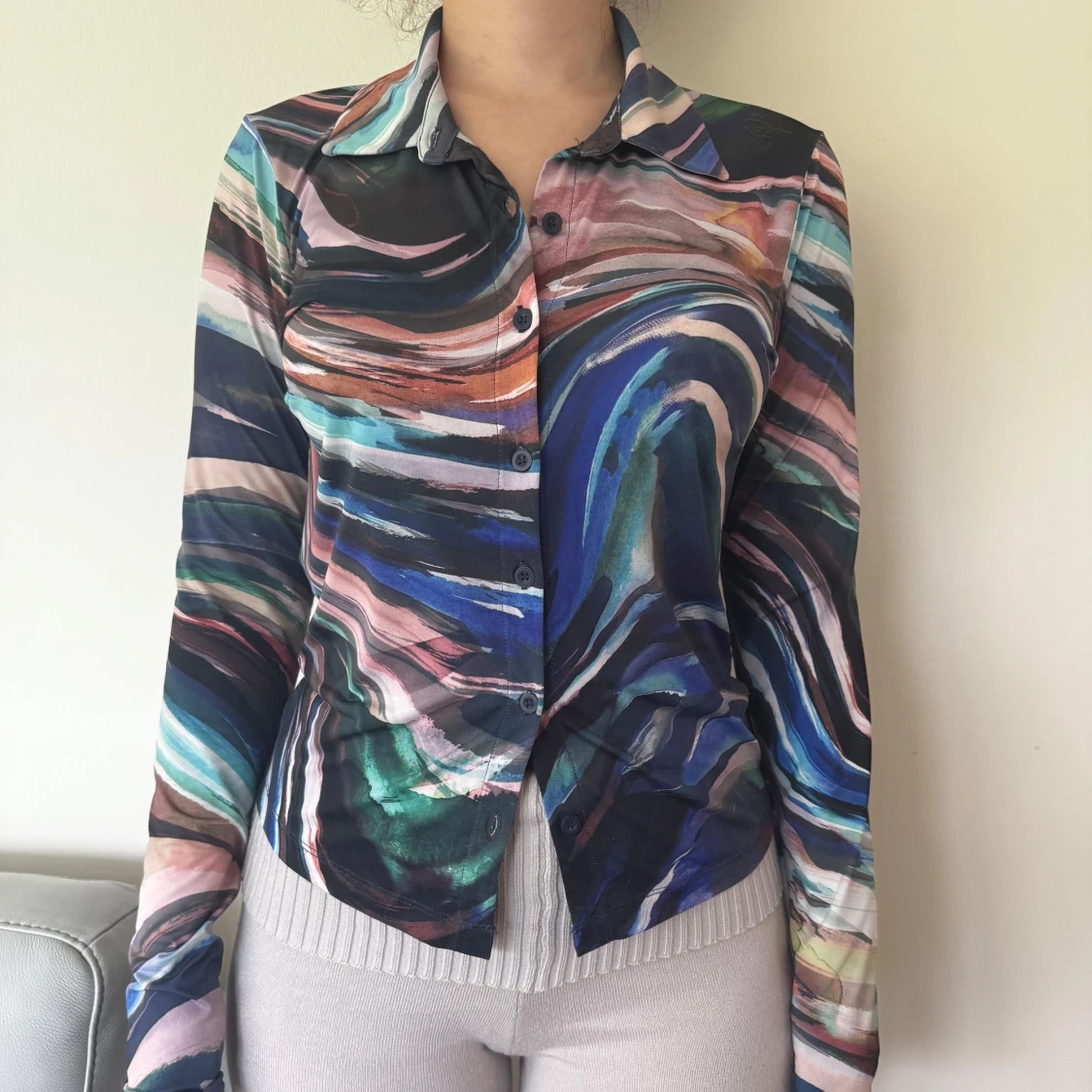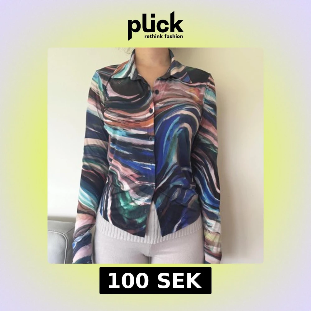Säljer en skjorta med unikt abstrakt mönster i blått, rosa, grönt och svart. Skjortan har klassisk krage, knäppning framtill och långa ärmar. Perfekt för dig som vill sticka ut med färg och stil.