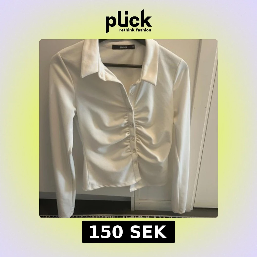 Snygg vit skjorta från BikBok i storlek M. Skjortan har lång ärm, klassisk krage och knappar framtill. Snygg rynkdetalj längs knappraden ger en modern och trendig look. Perfekt att styla med jeans eller kjol.