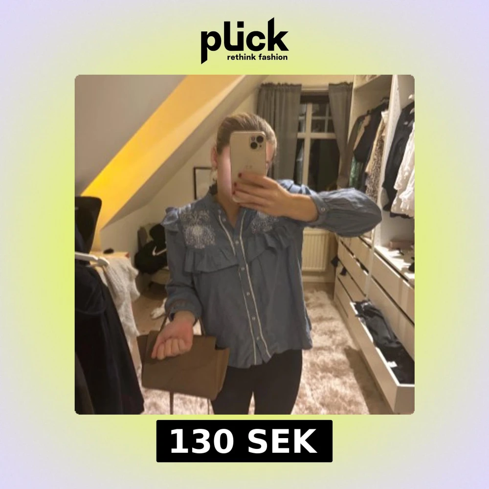 Säljer en snygg blå blus från Pigalle med volangdetaljer och knappar framtill. Blusen har långa ärmar och en avslappnad passform, perfekt för en stilren look.