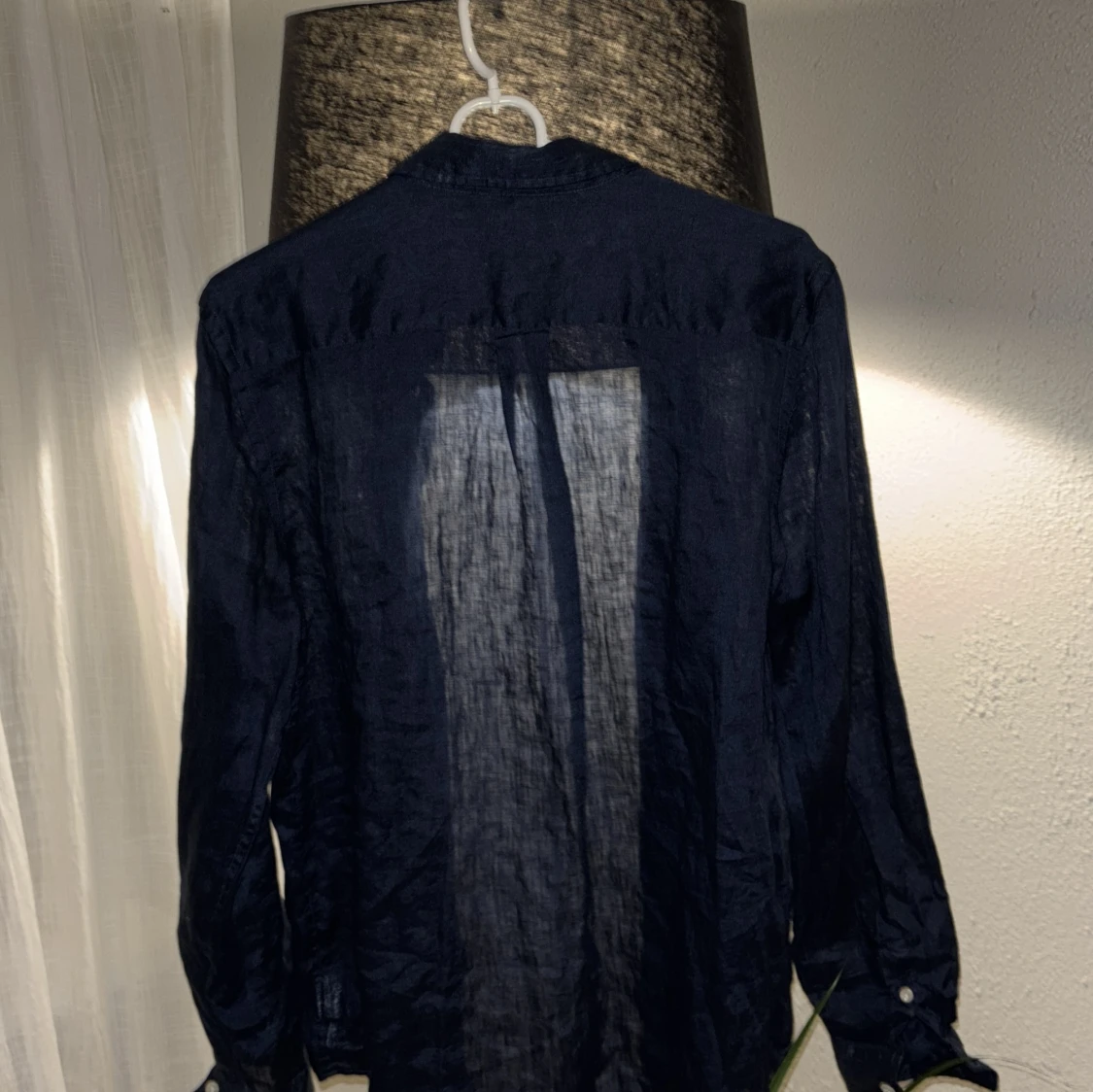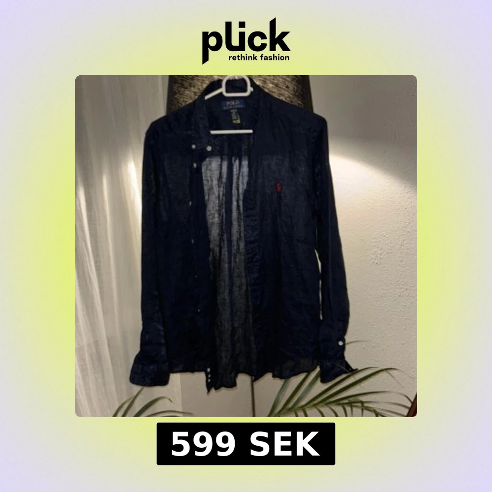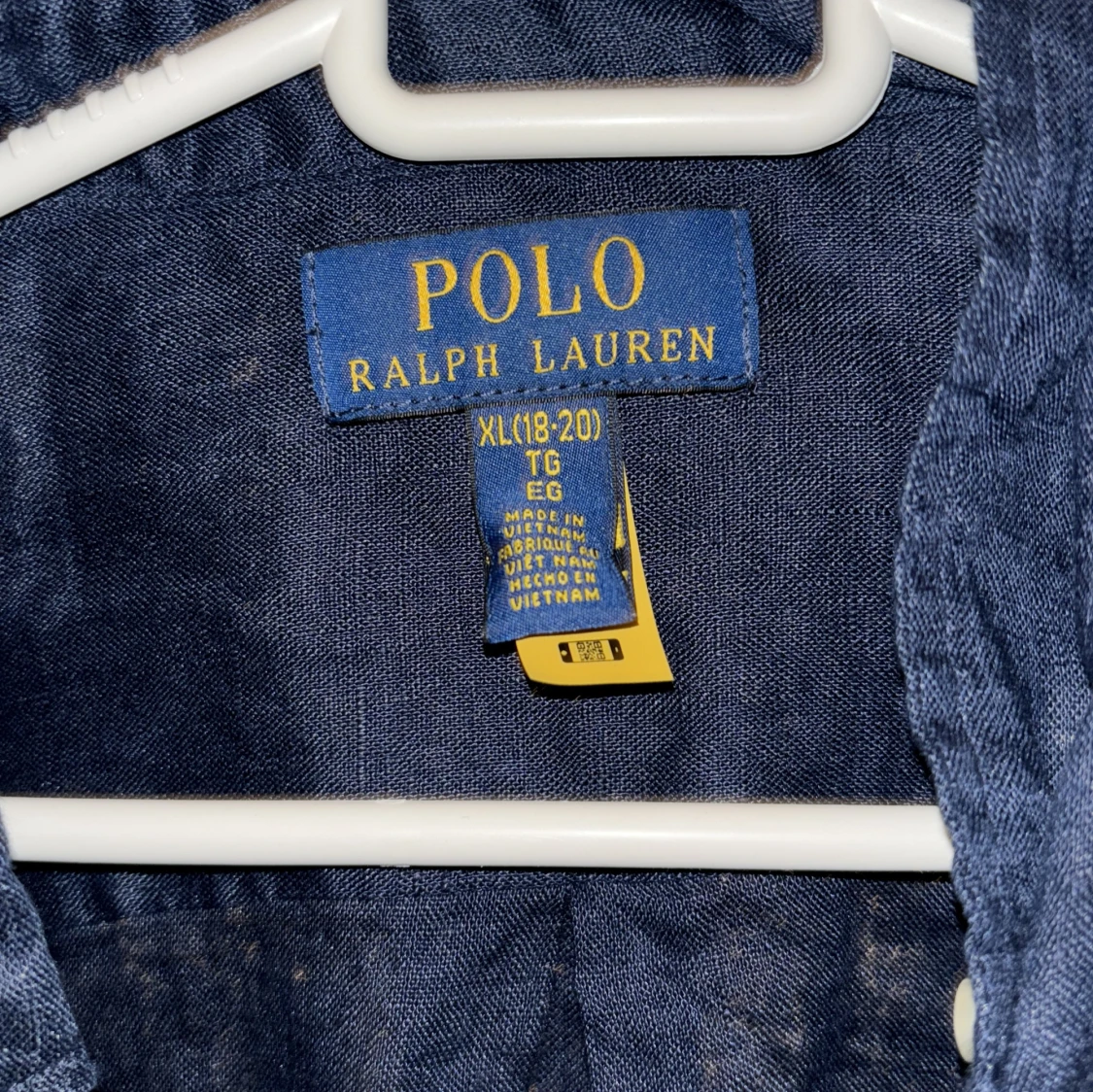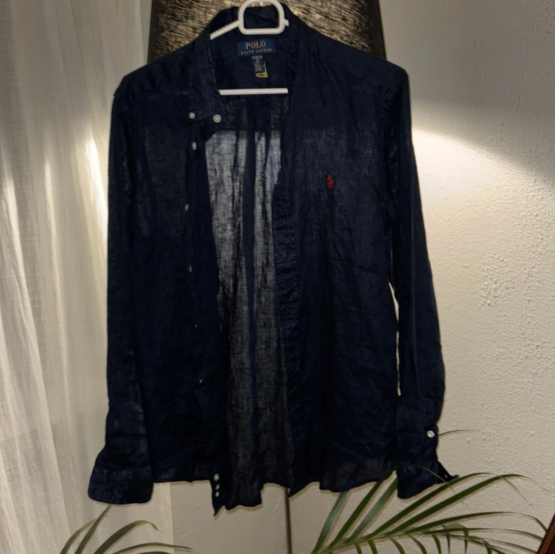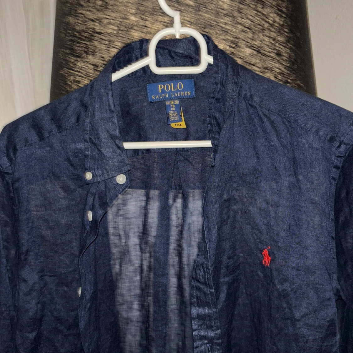 Snygg mörkblå skjorta i linne från Polo Ralph Lauren, storlek XL ca 175. Skjortan har klassisk krage, långa ärmar med manschett och knappar framtill. På bröstet finns den ikoniska röda Polo-loggan broderad. Perfekt för dig som gillar stilrena och bekväma plagg.