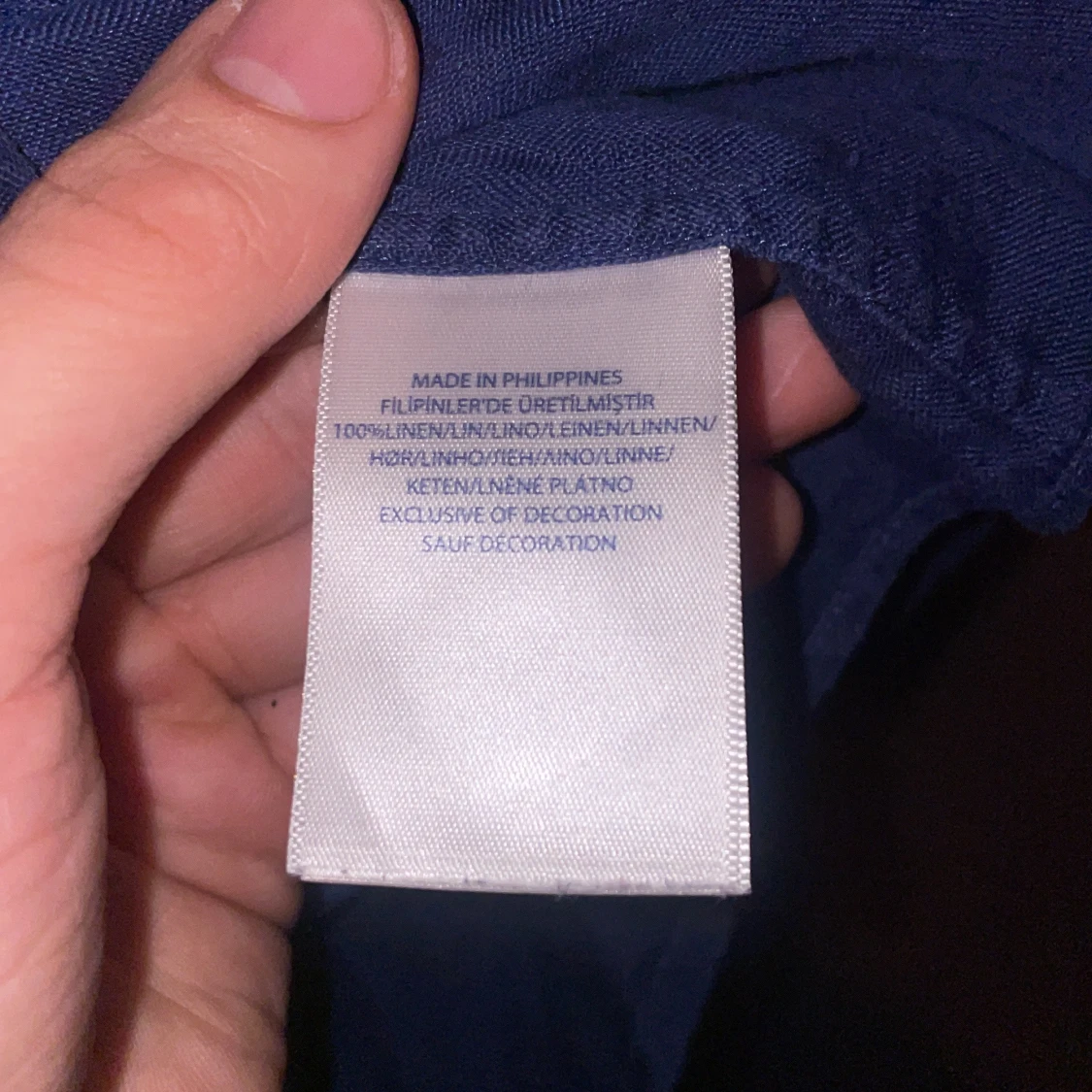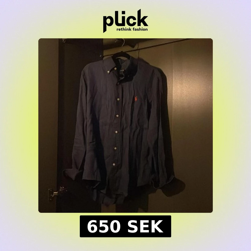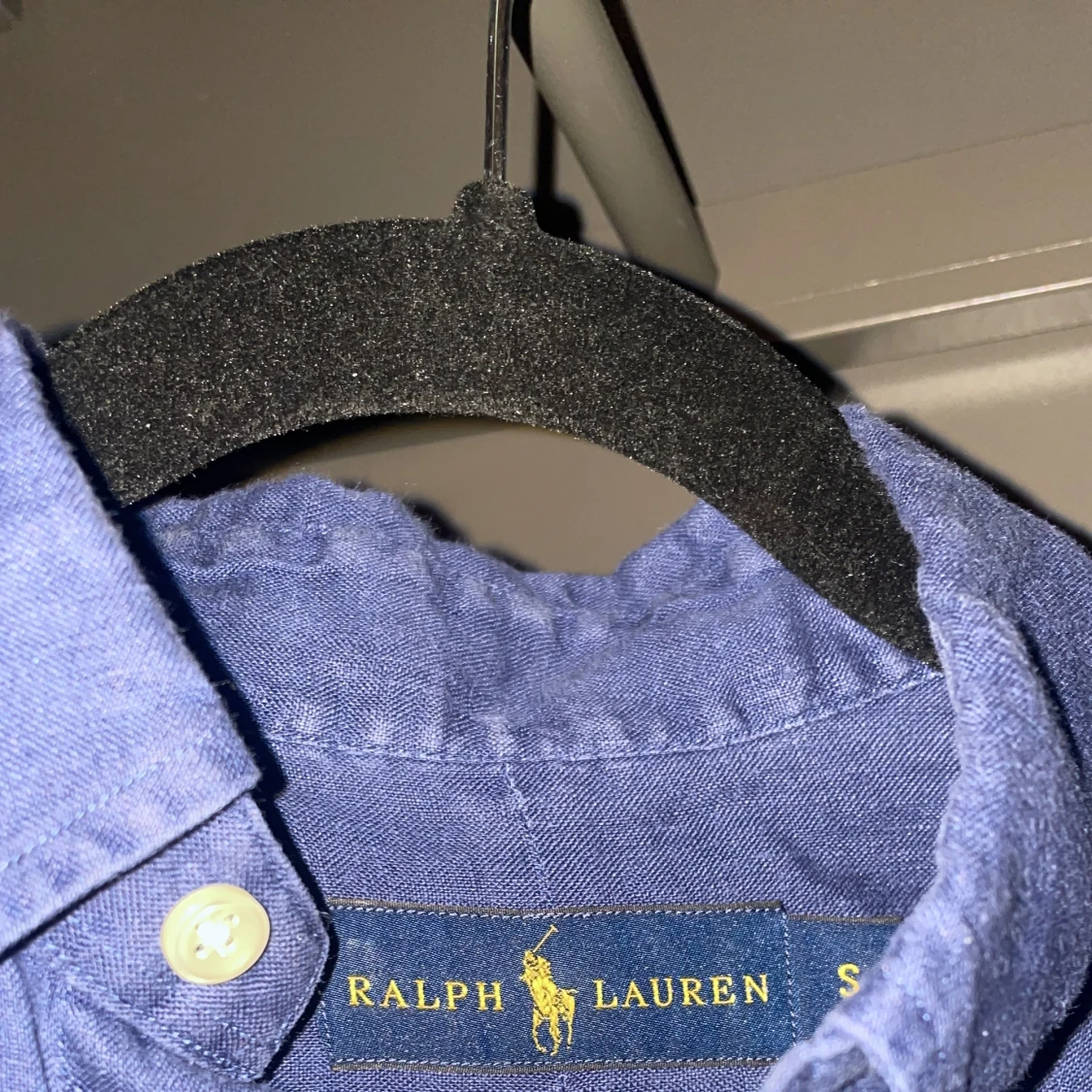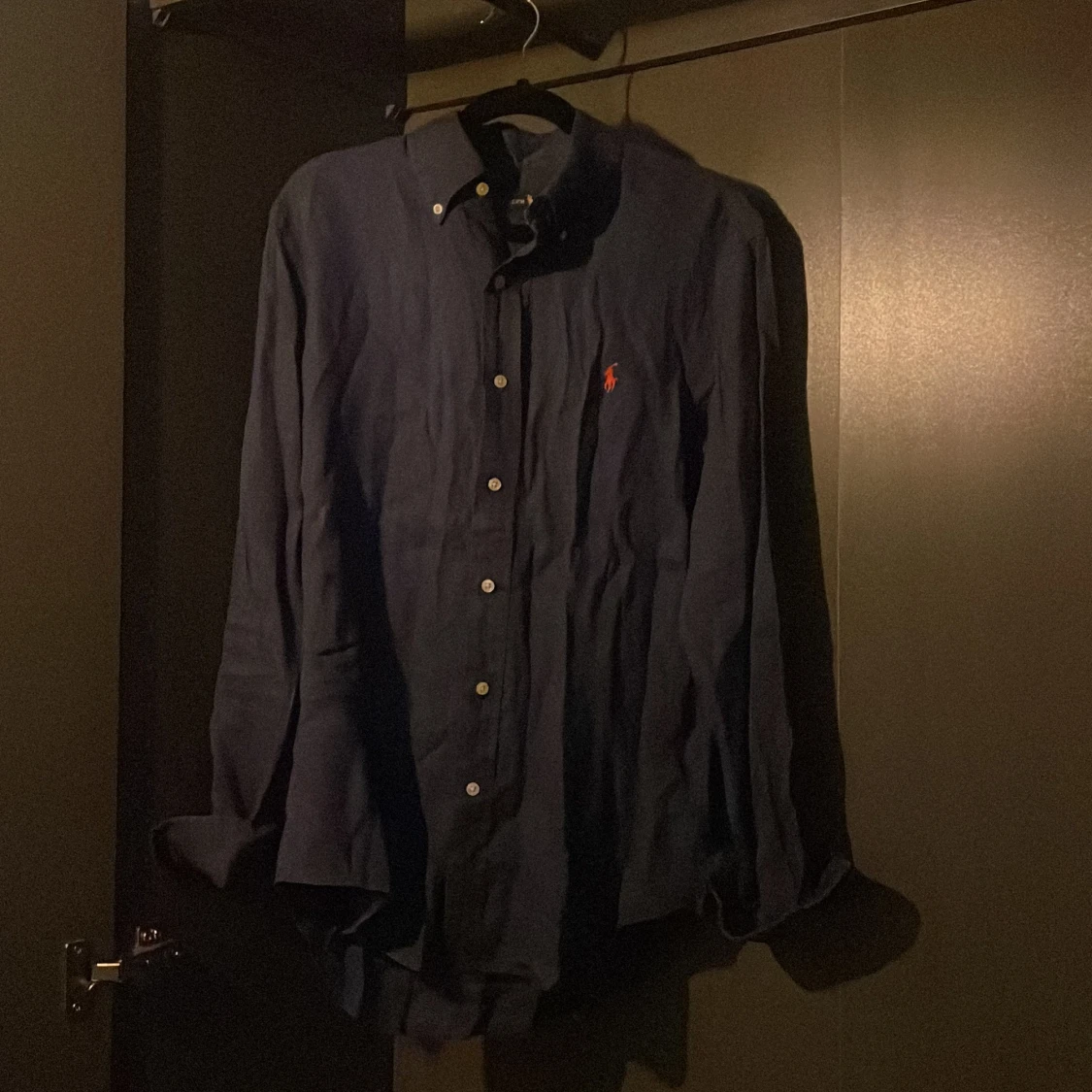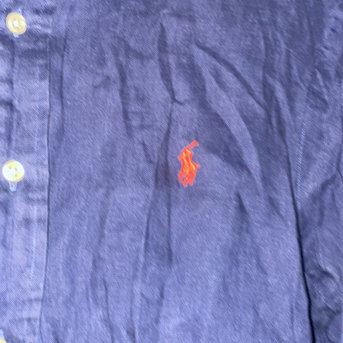 Säljer en stilren blå linneskjorta från Ralph Lauren med klassisk krage och knappar framtill. Skjortan har en broderad logotyp i rött på bröstet. Perfekt för en avslappnad men ändå elegant look.