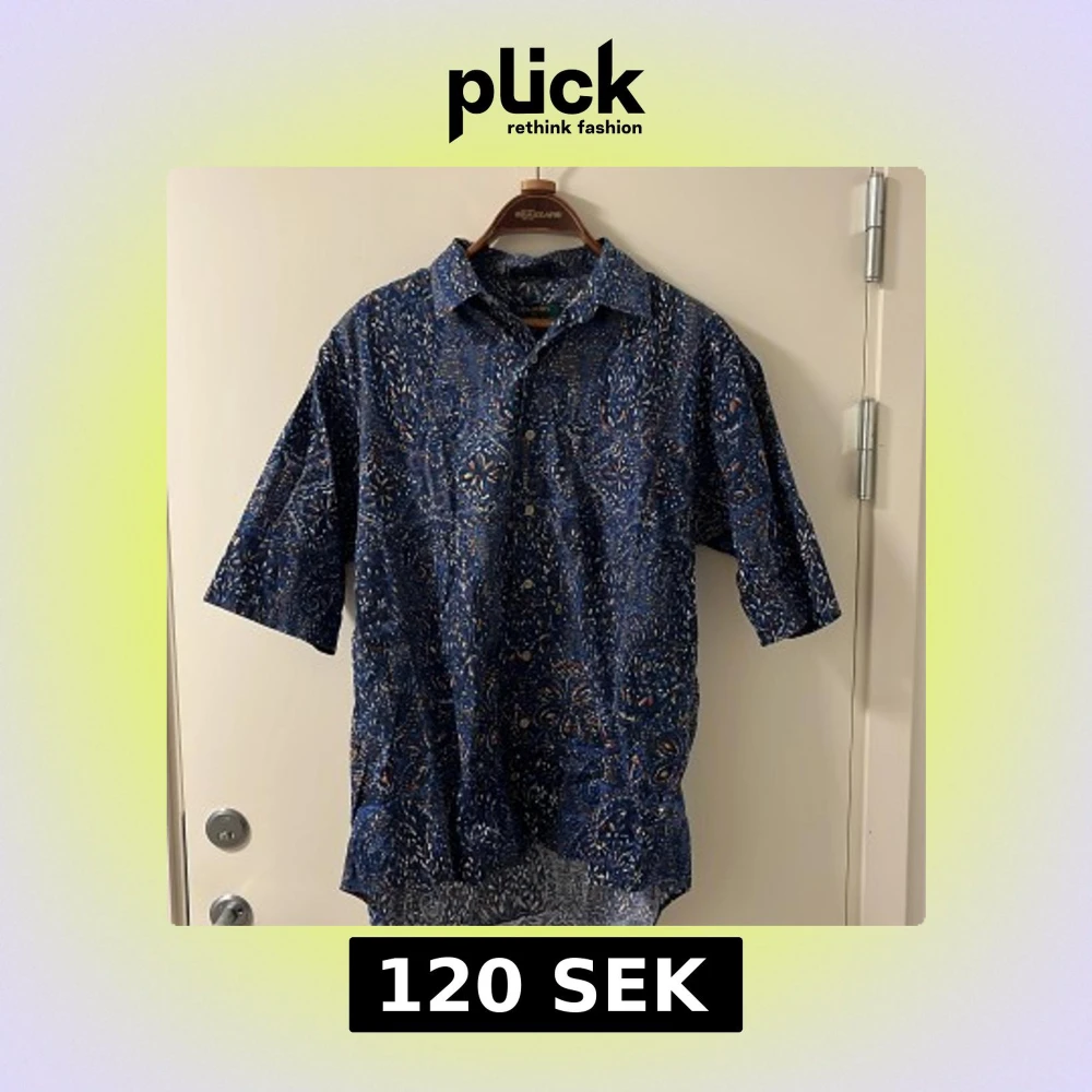 Säljer en blå kortärmad skjorta från Colours by Alexander Julian. Skjortan har ett färgstarkt abstrakt mönster i vitt, orange och gult samt knappar framtill. Tillverkad i 100% bomull, perfekt för varma dagar.