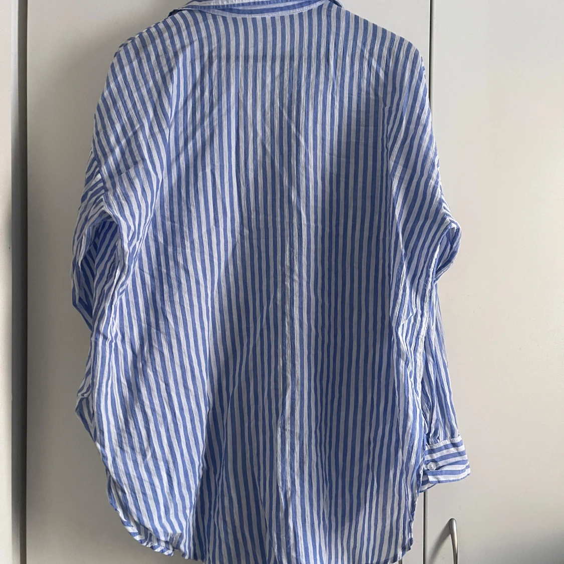 Säljer en stilren blå och vit randig skjorta med knappar framtill. Skjortan har en avslappnad passform och långa ärmar, perfekt för en casual look. Tillverkad i ett lätt och bekvämt material.