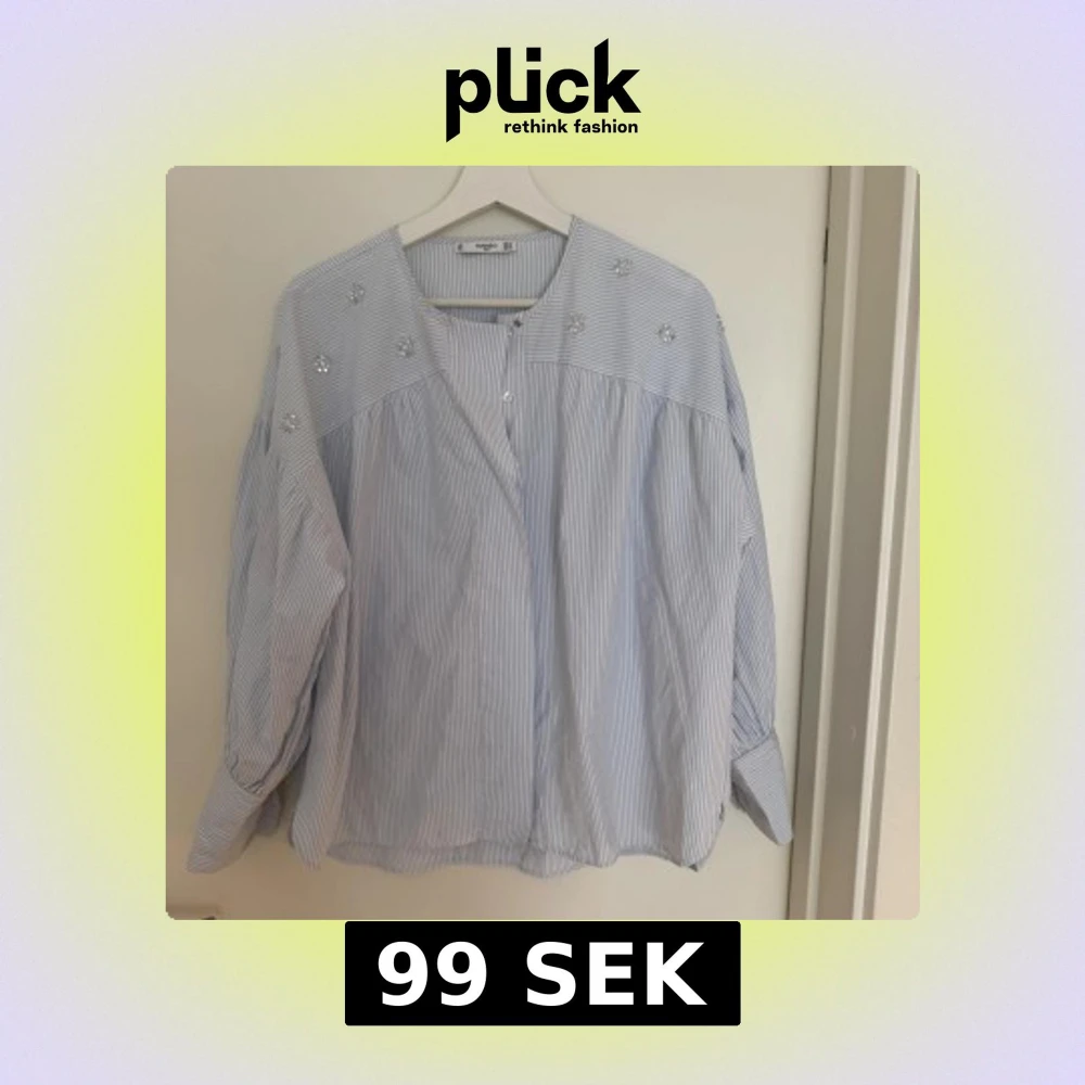 Säljer en stilren blå- och vitrandig blus från Mango med dekorativa pärlor på axlarna. Blusen har långa ärmar och en avslappnad passform, perfekt för en chic look. Den är tillverkad i ett lätt och bekvämt material.