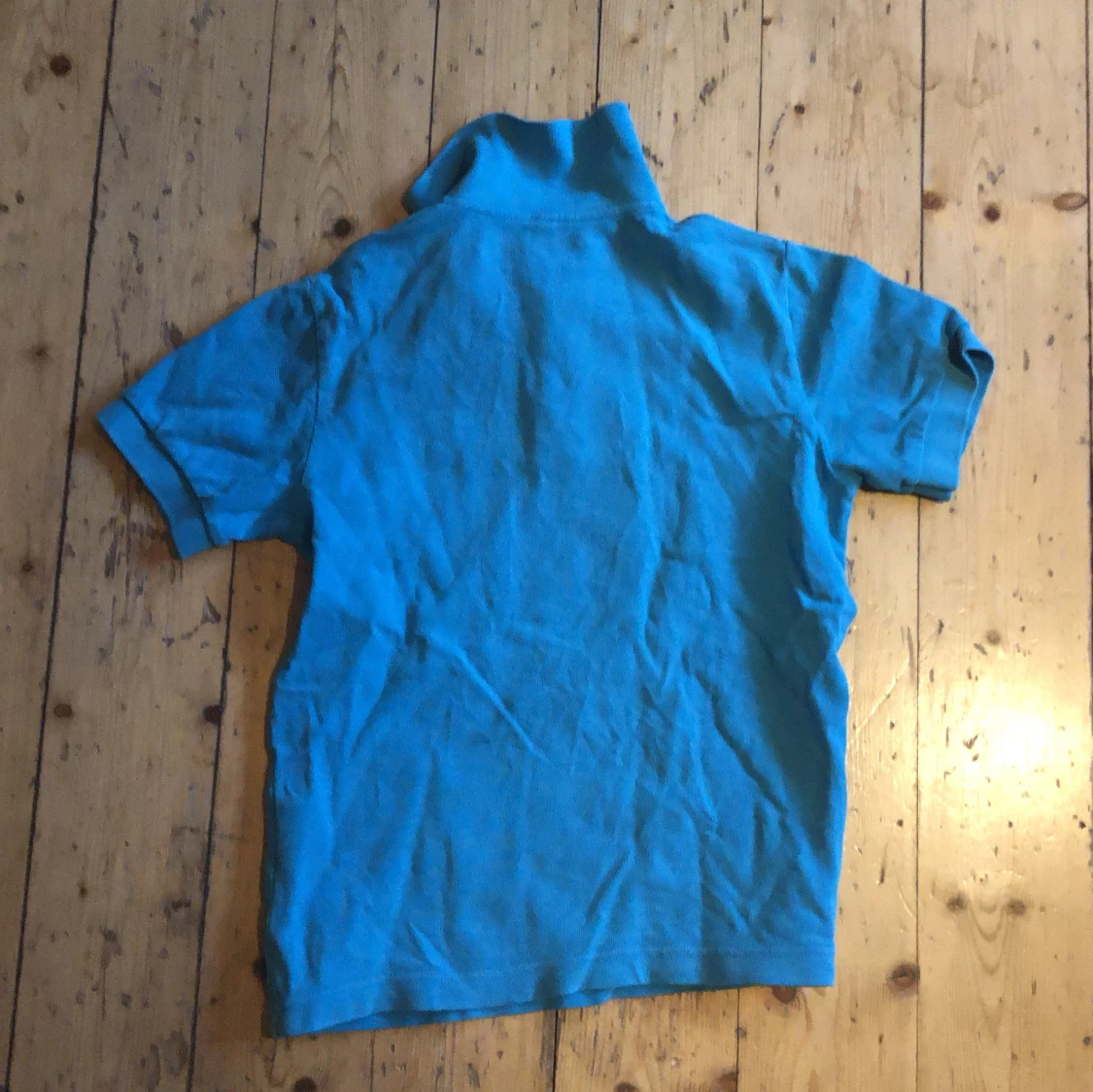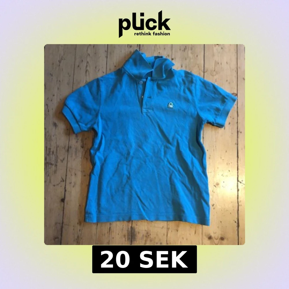 Säljer en blå pikétröja från Benetton med klassisk krage och knappar framtill. Tröjan har korta ärmar och en liten broderad logga på bröstet. Perfekt för en avslappnad och stilren look.