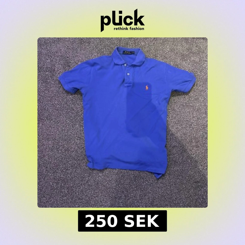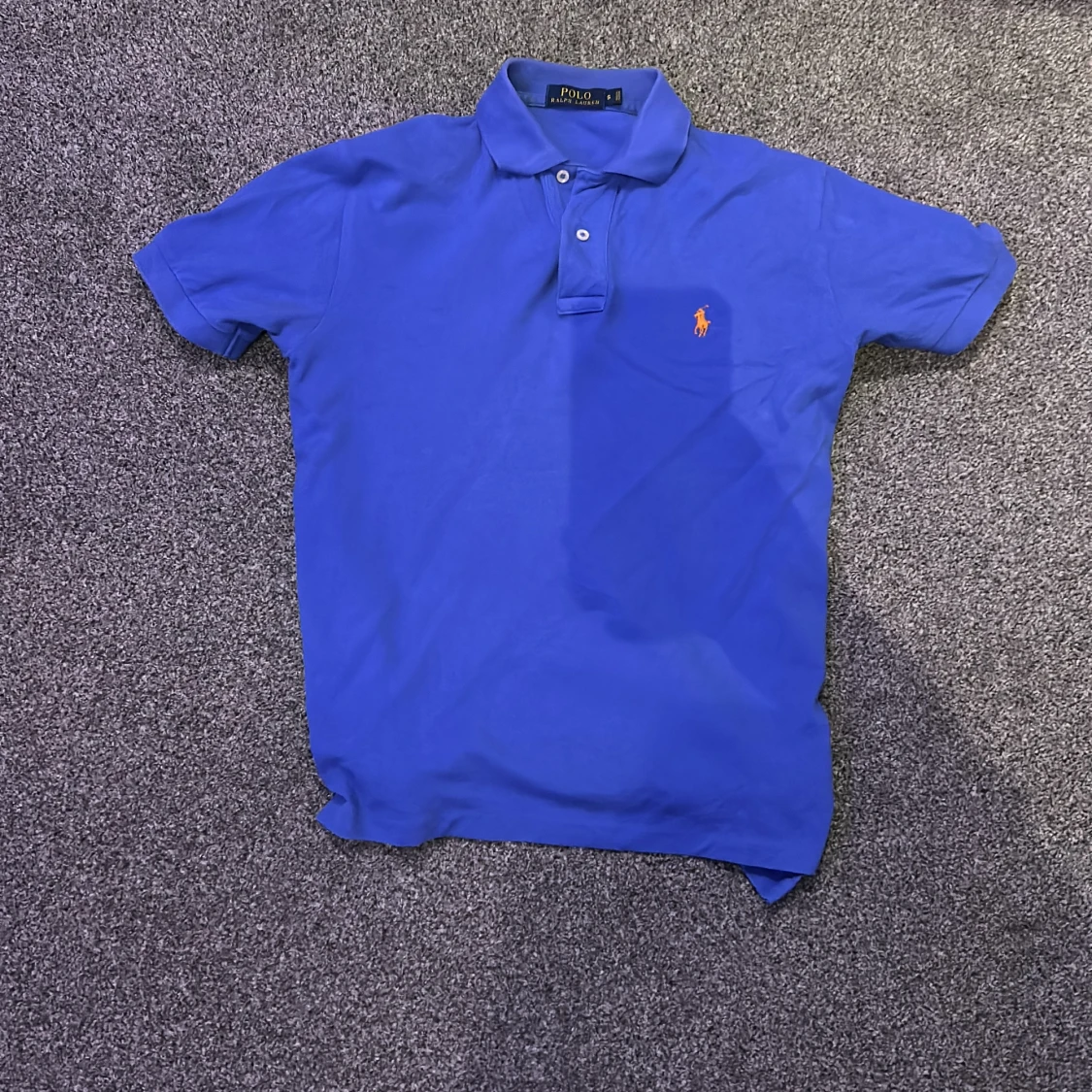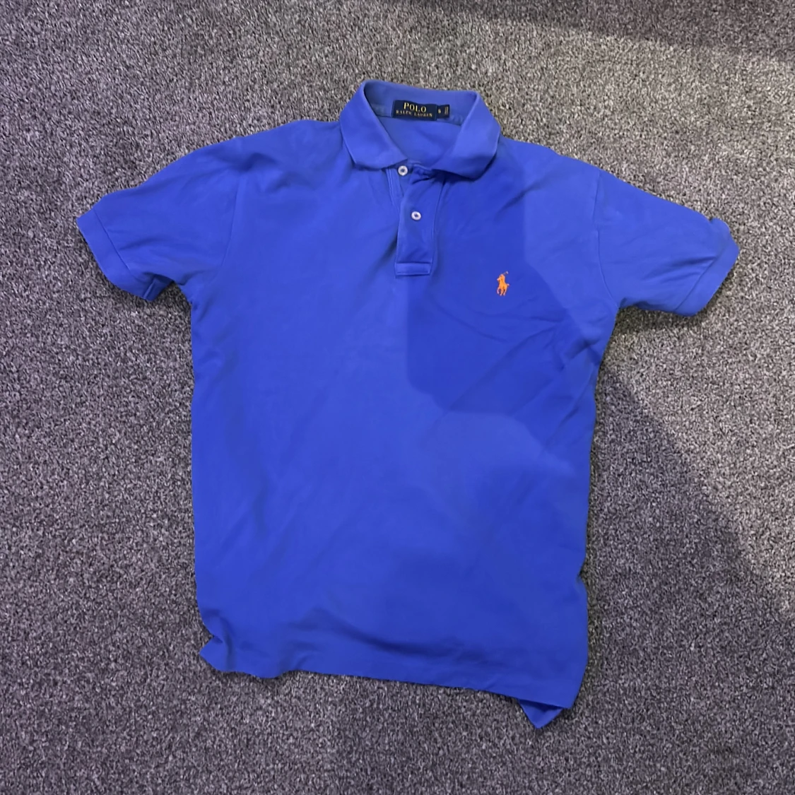 Snygg blå pikétröja från Ralph Lauren med klassisk krage och knappslå. Den har en liten orange logotyp broderad på bröstet. Perfekt för en stilren look.