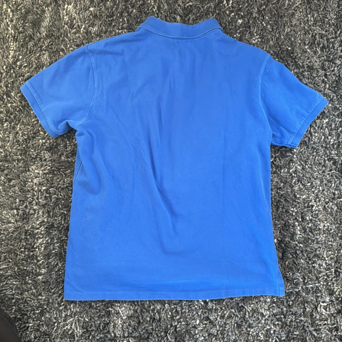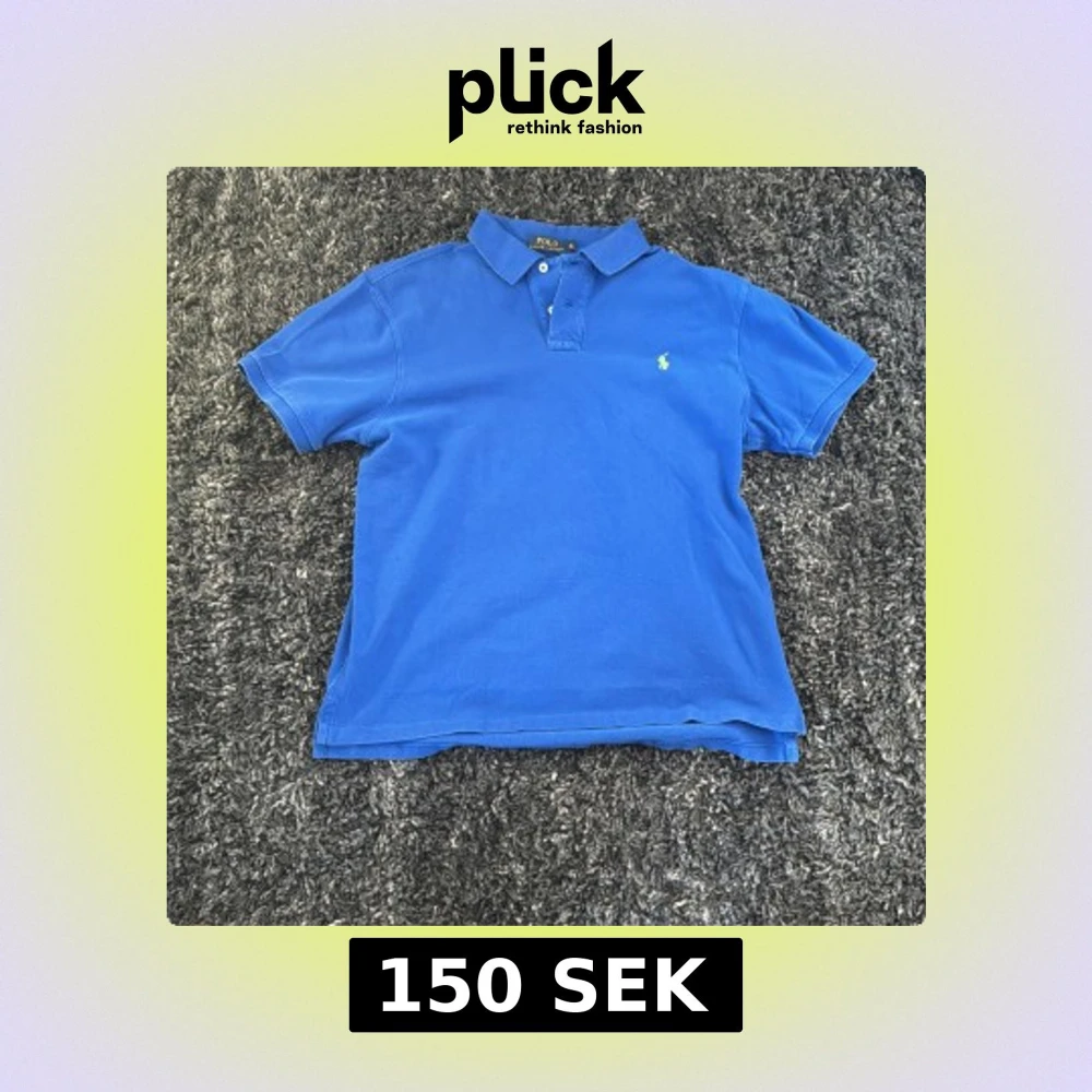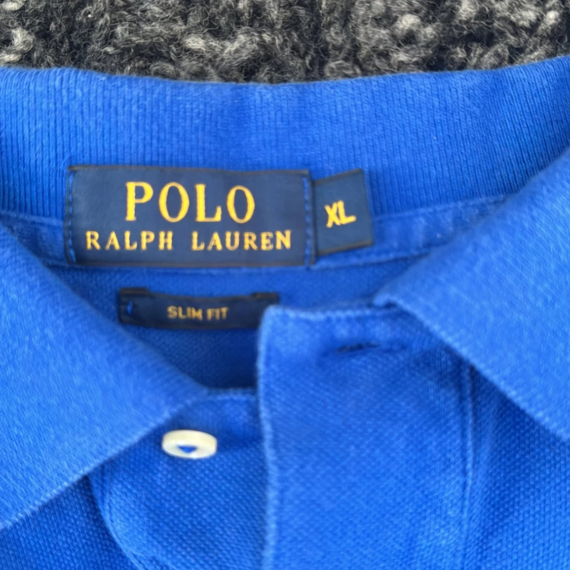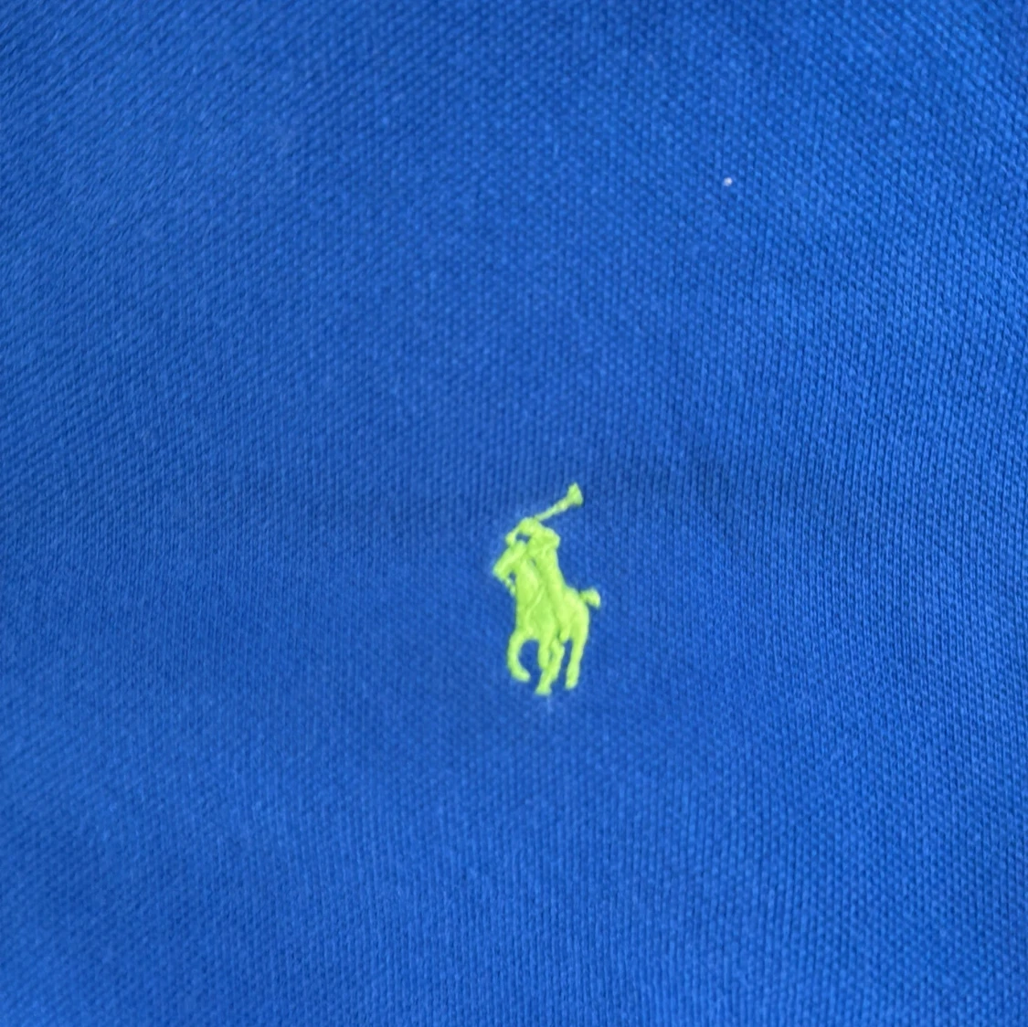 Säljer en snygg blå pikétröja från Ralph Lauren i slim fit. Tröjan har korta ärmar och en klassisk krage med knappar. Den ikoniska loggan är broderad i grönt på bröstet. Perfekt för en stilren look!