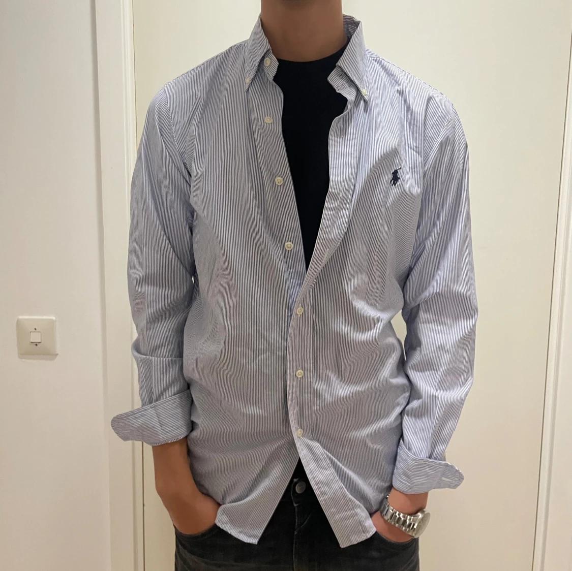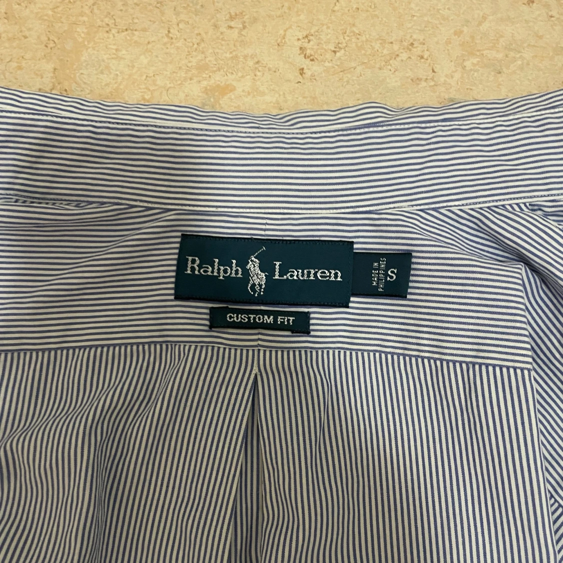 Säljer en snygg och stilren randig skjorta från Ralph Lauren i storlek S. Skjortan är vit med tunna blå ränder och har en broderad logga på bröstet. Den är långärmad och har knappar hela vägen ner. Perfekt för både vardag och fest!