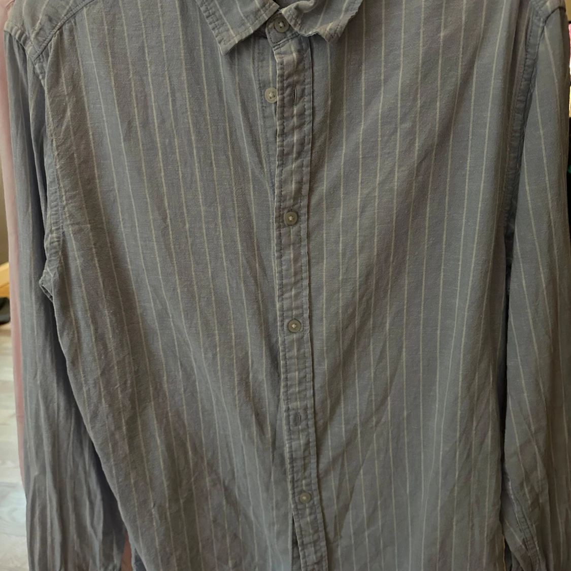 Snygg blå linneskjorta med tunna vita ränder och klassisk krage. Skjortan har långa ärmar och knäppning framtill. Perfekt för dig som gillar en stilren och enkel look.