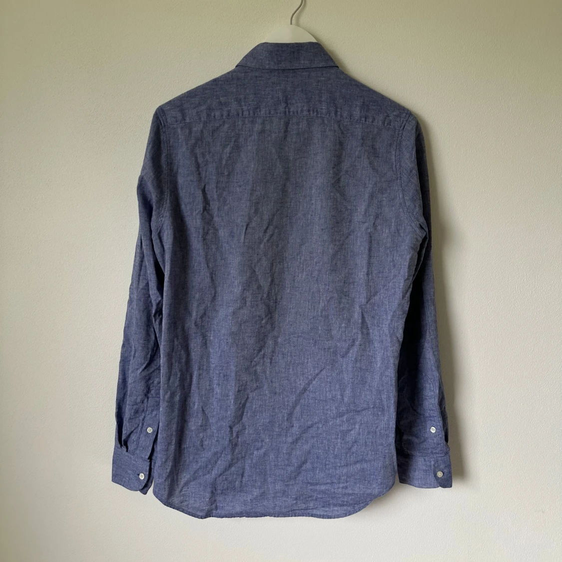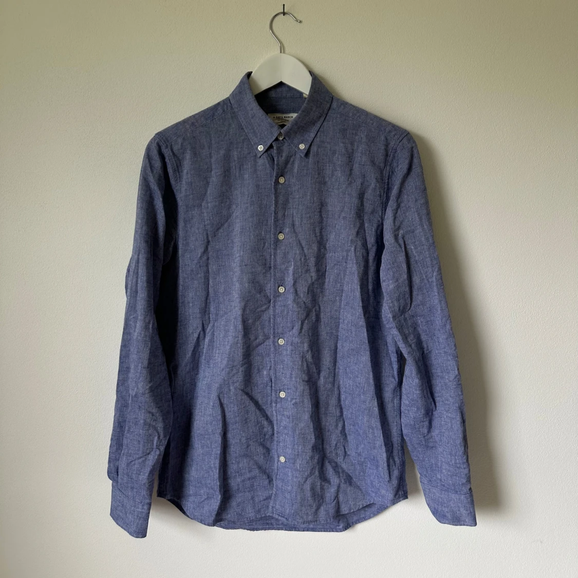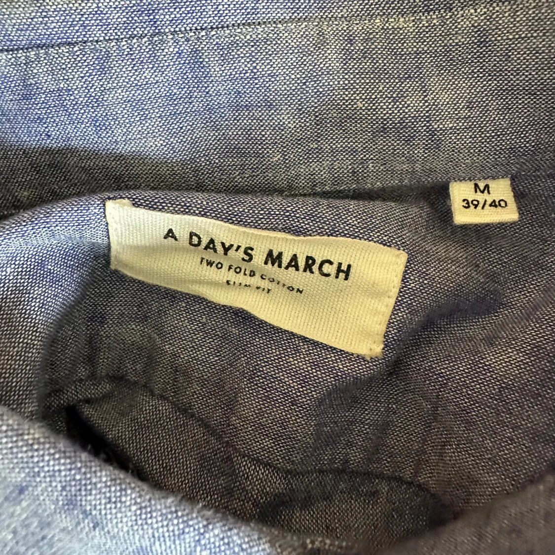 Snygg blå skjorta från A Day's March i storlek M, tillverkad i tvåfaldig bomull. Skjortan har klassisk krage, knäppning framtill och långa ärmar med manschett. Slim fit-modell som sitter snyggt och stilrent. Artnr:C388