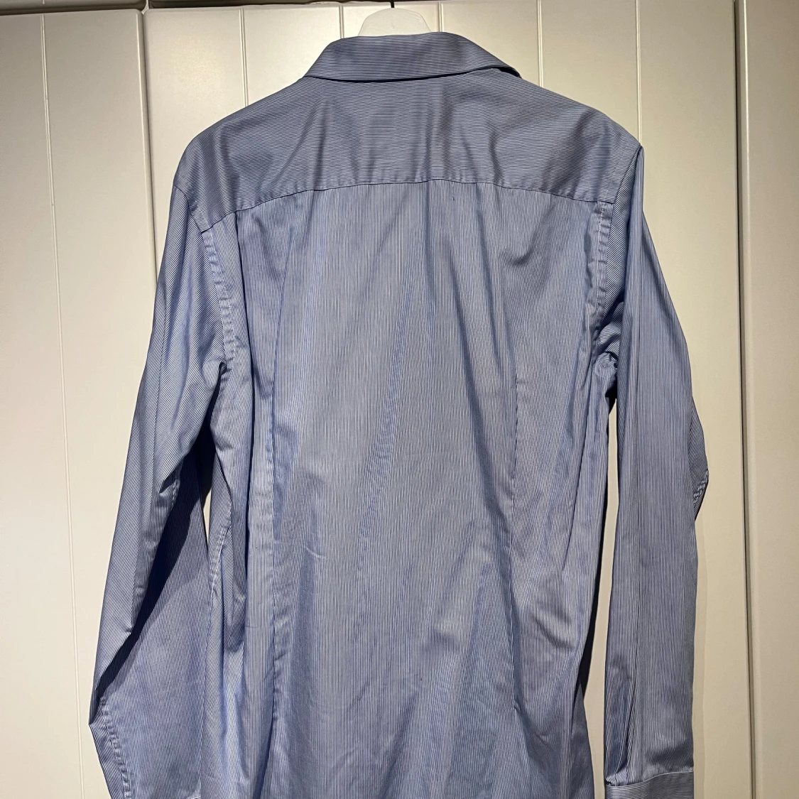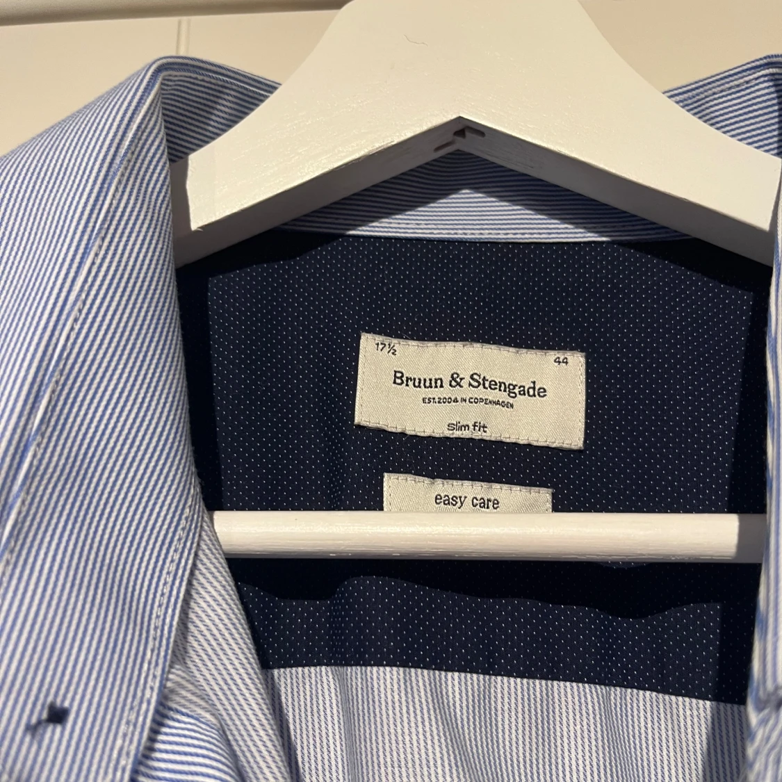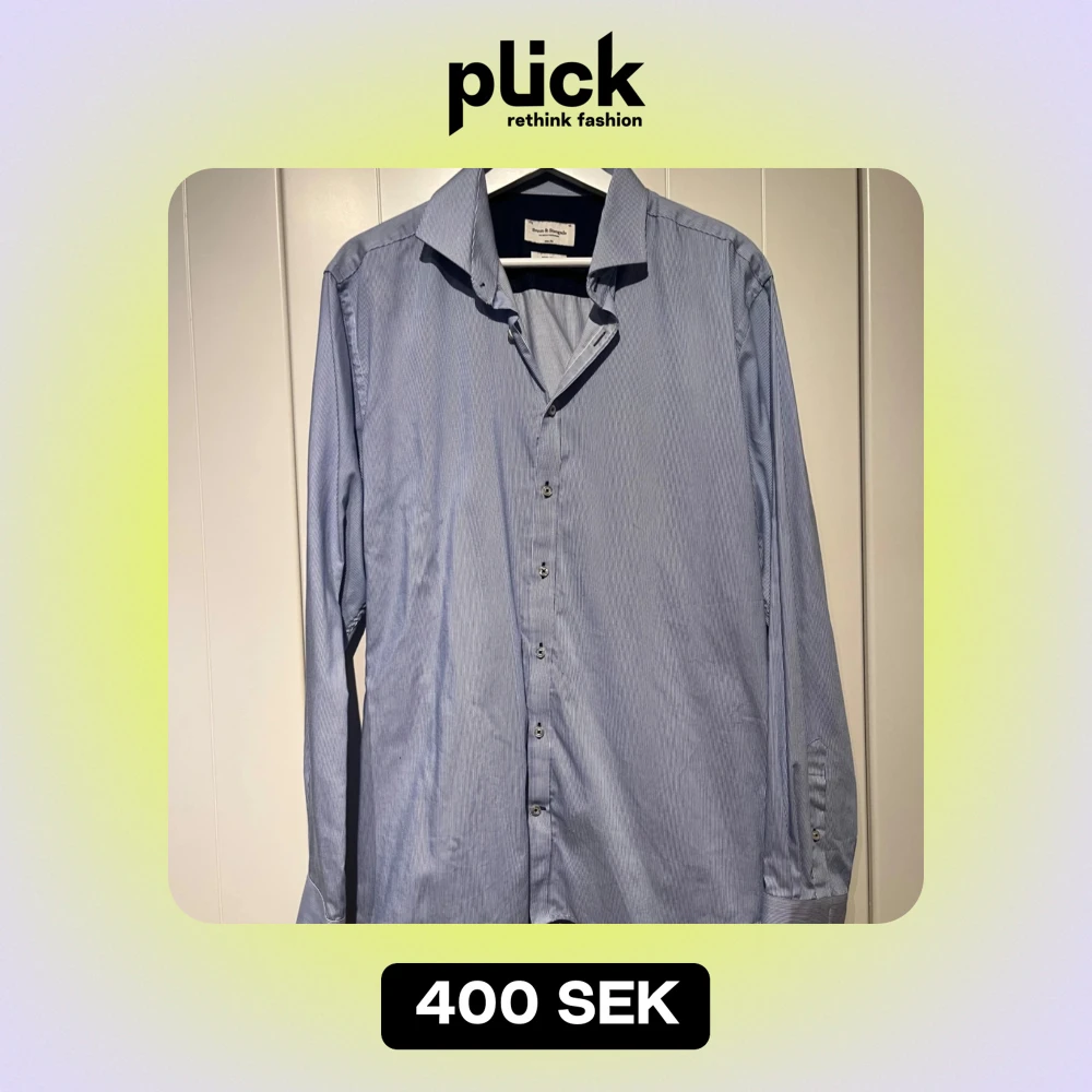 Säljer en stilren blå skjorta från Bruun & Stengade i slim fit. Skjortan har ett diskret randigt mönster och är tillverkad i ett lättskött material. Stryker du skjortan är den så gott som ny. Nypris 900:-