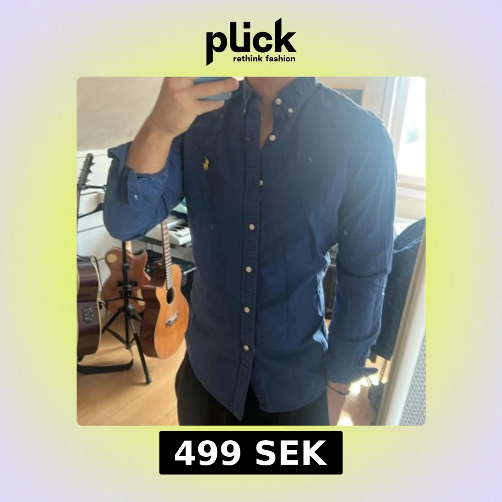 Säljer en klassisk blå skjorta från Ralph Lauren med gul broderad logga på bröstet. Skjortan har knappar hela vägen, button-down krage och lång ärm. Perfekt för dig som gillar stilrena plagg med snygga detaljer.