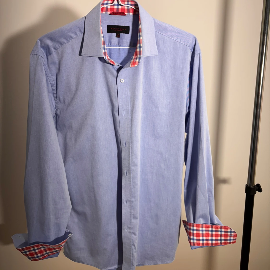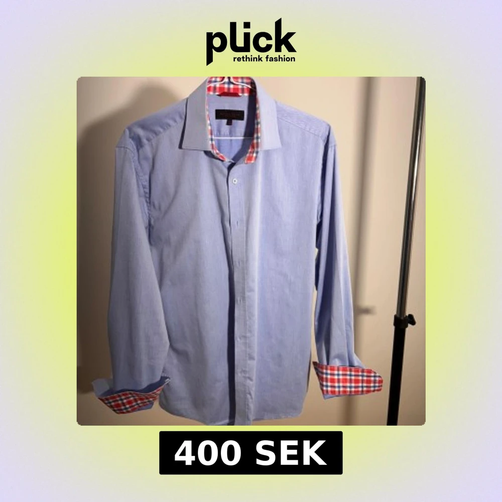 Snygg blå skjorta från The Seven Seas med rutiga röda, vita och blå detaljer på insidan av kragen och manschetterna. Skjortan har klassisk krage, knäppning framtill och långa ärmar. 100% bomull, Perfekt för dig som vill ha en stilren look med en twist.