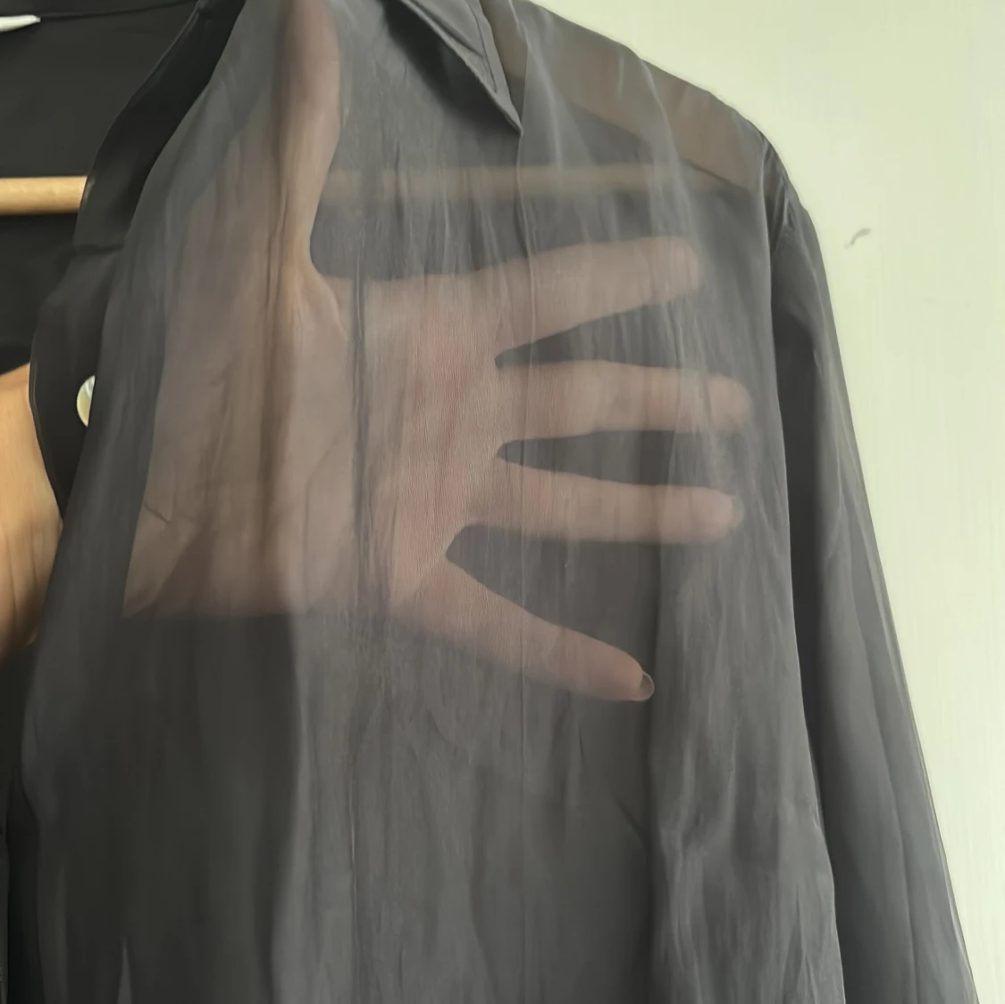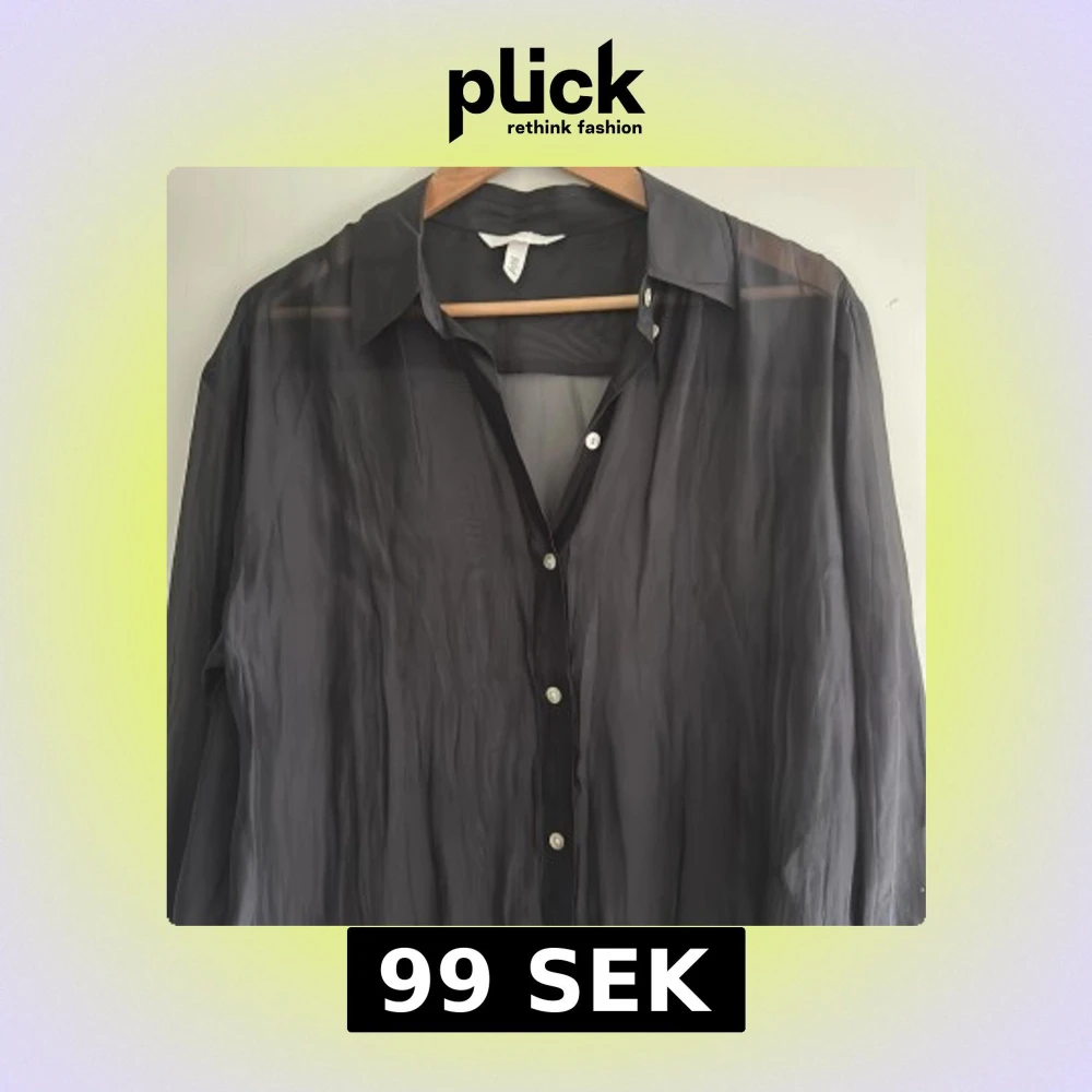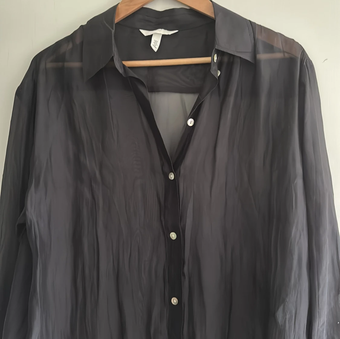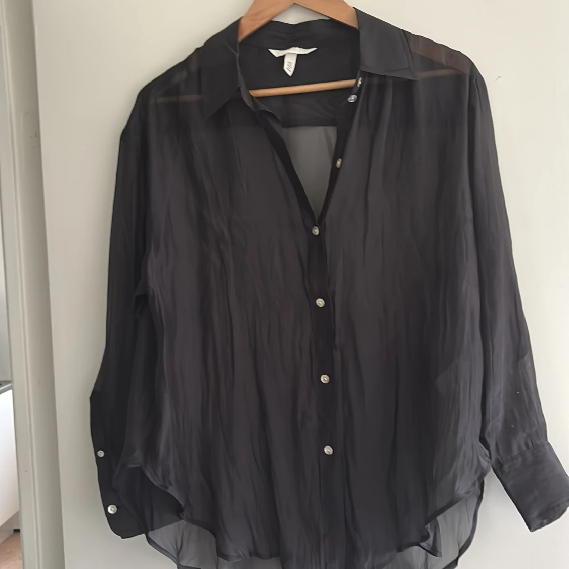 Svart transparent skjorta från H&M med klassisk krage och vita knappar framtill. Skjortan har lång ärm och är tillverkad i ett tunt, lätt och flowy material som ger en cool och edgy vibe. Perfekt att styla lager på lager eller över ett linne.