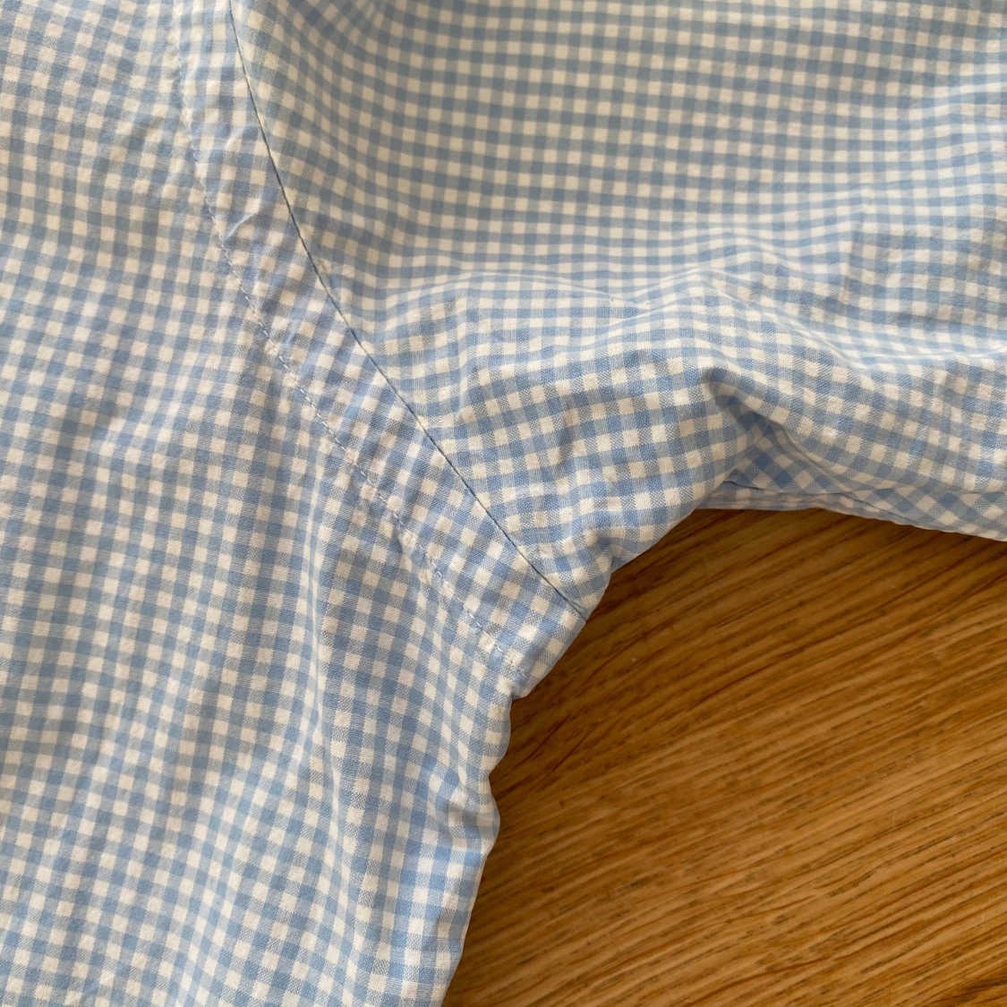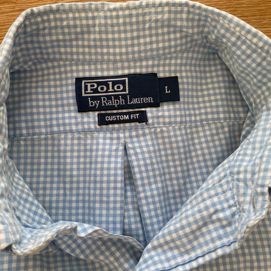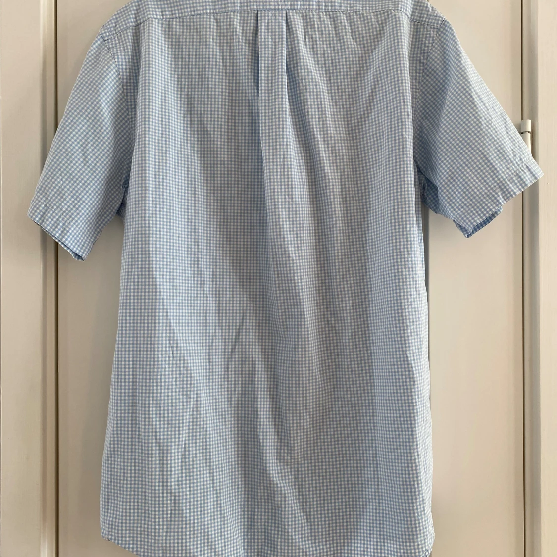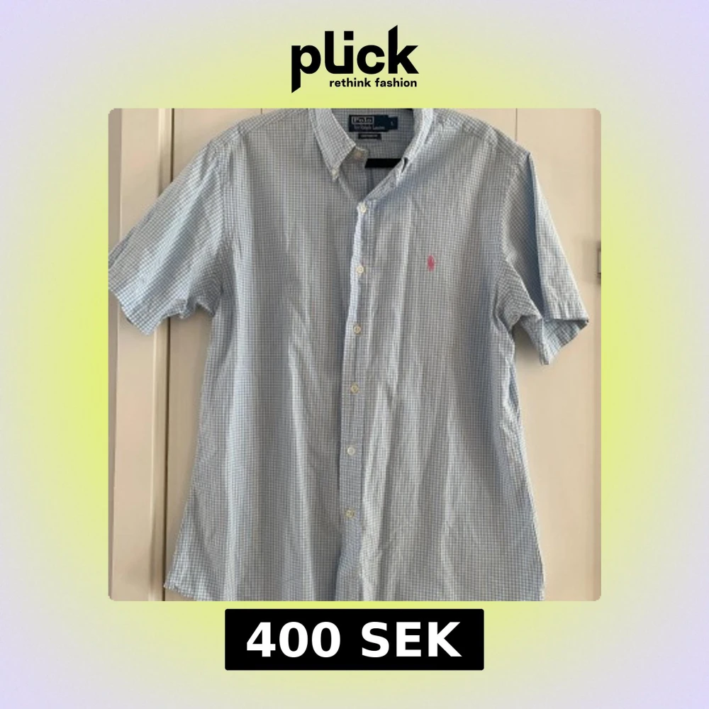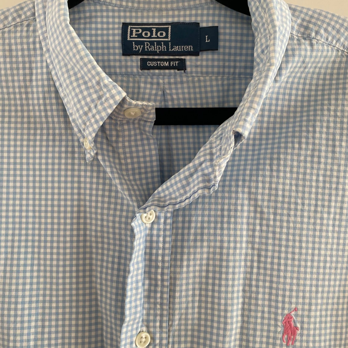 Kortärmad skjorta från Polo Ralph Lauren i custom fit. Skjortan är blårutig med små vita rutor, har klassisk krage, knappar framtill och en rosa broderad logga på bröstet. Tillverkad i tunn bomull, perfekt för varma dagar. Mått Över bröstet: ca 58 cm Längd från axeln och ner: ca 75 cm Material: 100% bomull Kommer från ett djur- och rökfritt hem.