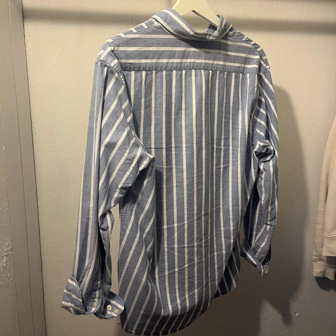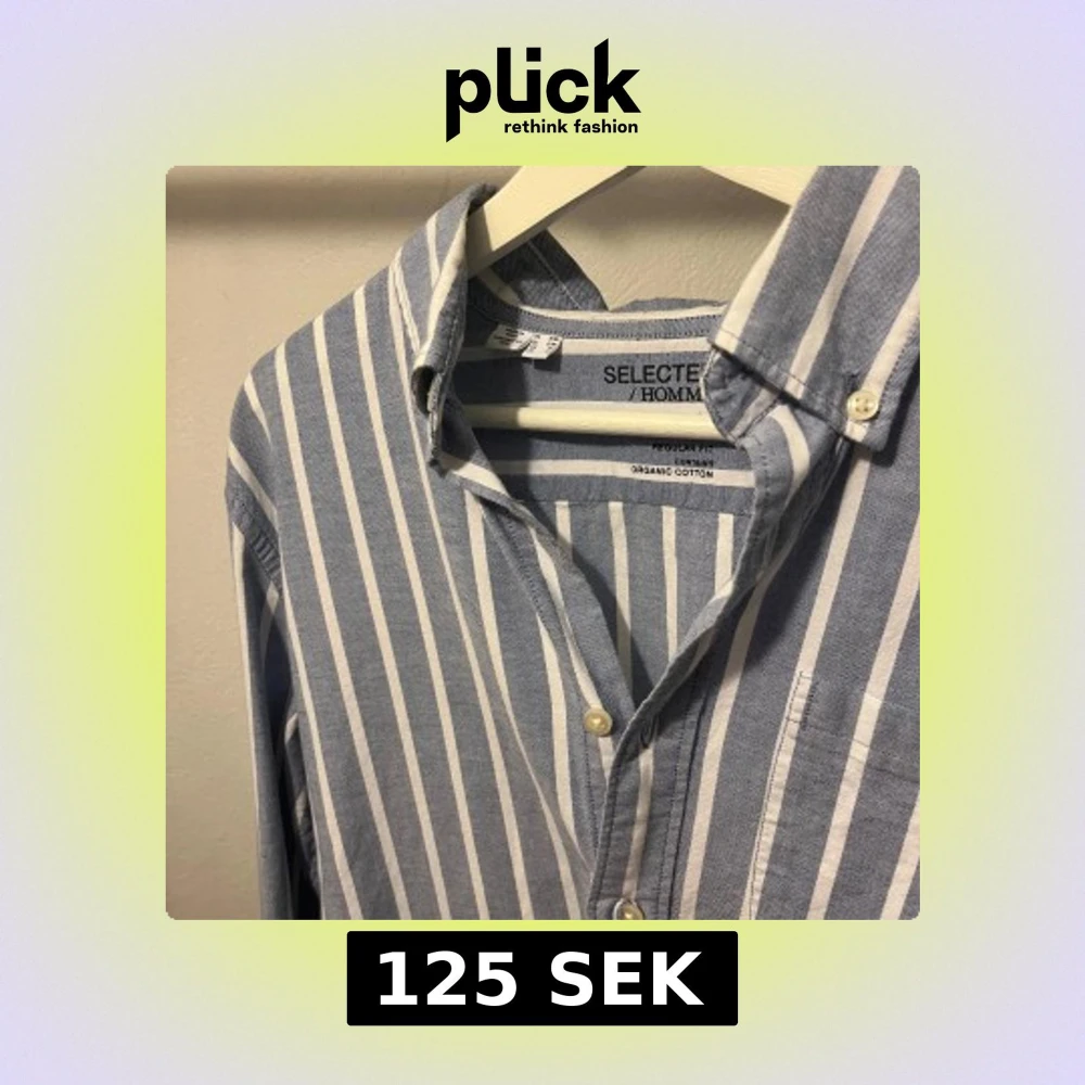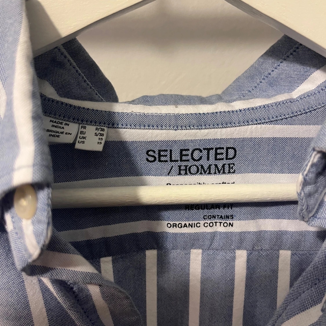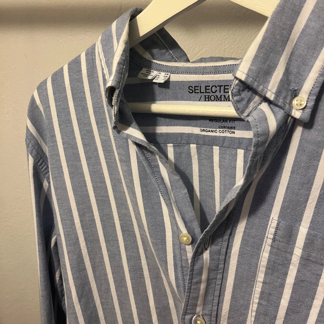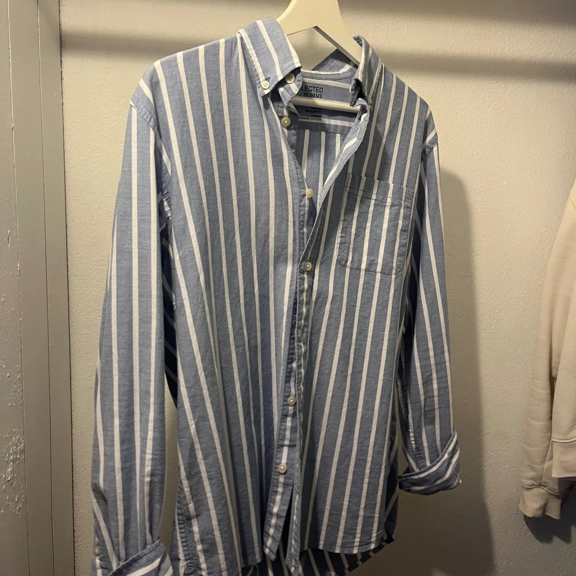 Snygg blå och vit randig skjorta från Selected Homme i ekologisk bomull. Skjortan har klassisk krage, bröstficka och knäppning framtill. Regular fit och långa ärmar med manschett. Perfekt för en clean och stilren look.