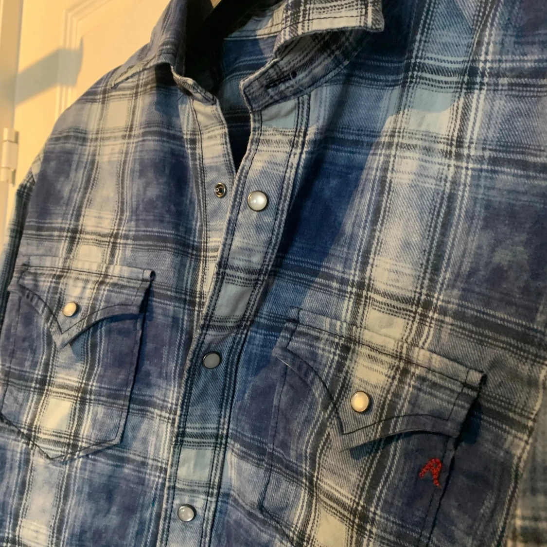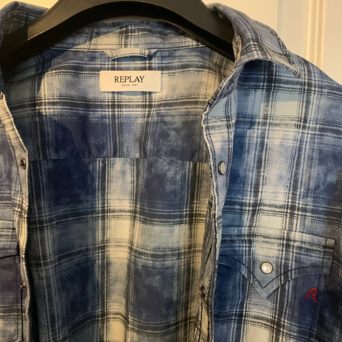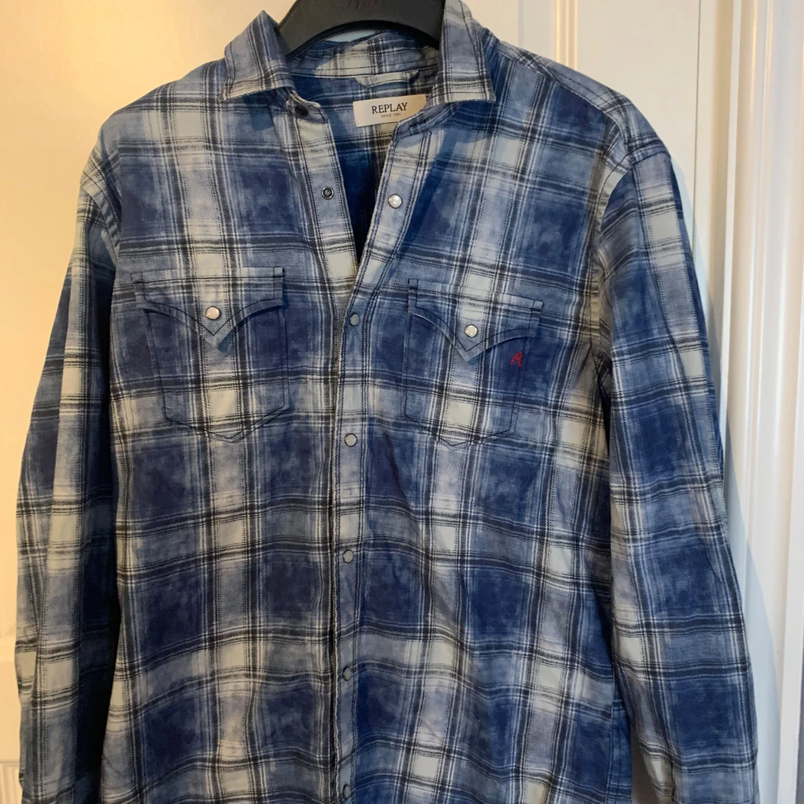 Snygg rutig skjorta från Replay i blått och vitt med tryckknappar och två bröstfickor. Skjortan har klassisk krage och lång ärm, perfekt för en avslappnad och cool look. Tillverkad i mjuk bomull för skön känsla hela dagen. Är i absolut toppskick och använd mindre än 5 gånger