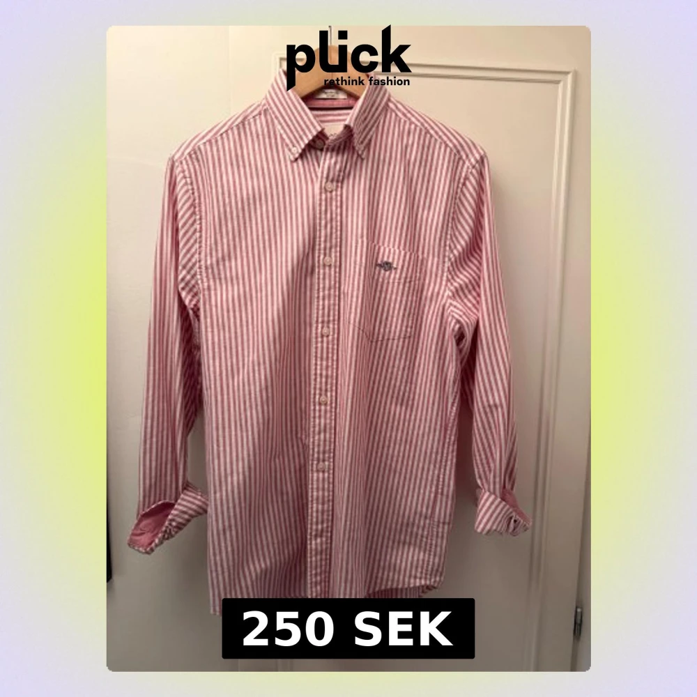 Säljer en klassisk skjorta från Gant med rosa och vita vertikala ränder. Skjortan har button down-krage, bröstficka med broderad logga och knäppning framtill. Tillverkad i mjuk bomull och har långa ärmar. Perfekt för en preppy look.