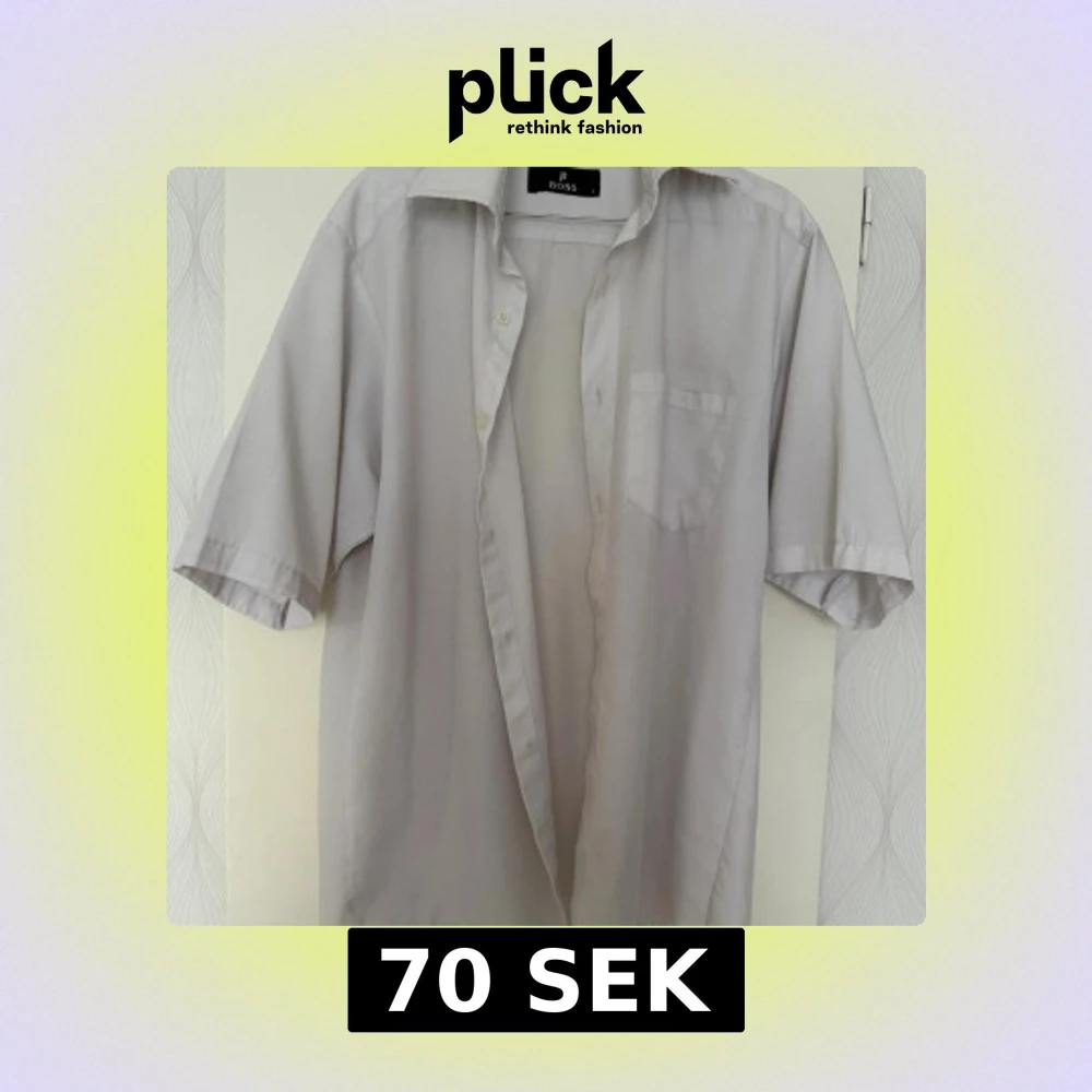 Vit skjorta från Boss köpt utomlands och det inte äkta, klassisk krage och korta ärmar. Skjortan har en bröstficka och knappar framtill. Materialet är mjukt och känns som bomull, perfekt för en clean och enkel stil.