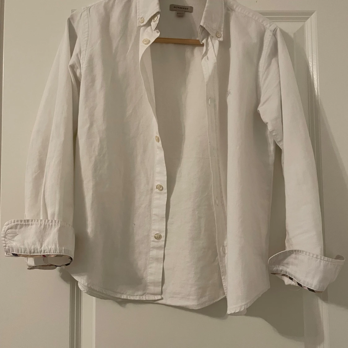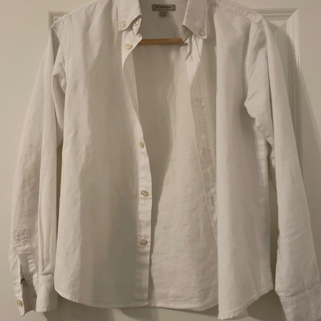 Säljer en klassisk vit skjorta från Burberry i mycket bra skick. Skjortan har långa ärmar och knappar framtill. Perfekt för både vardag och festliga tillfällen. Den är gjord i ett bekvämt bomullsmaterial och har en stilren design.