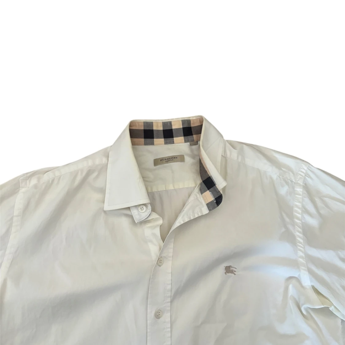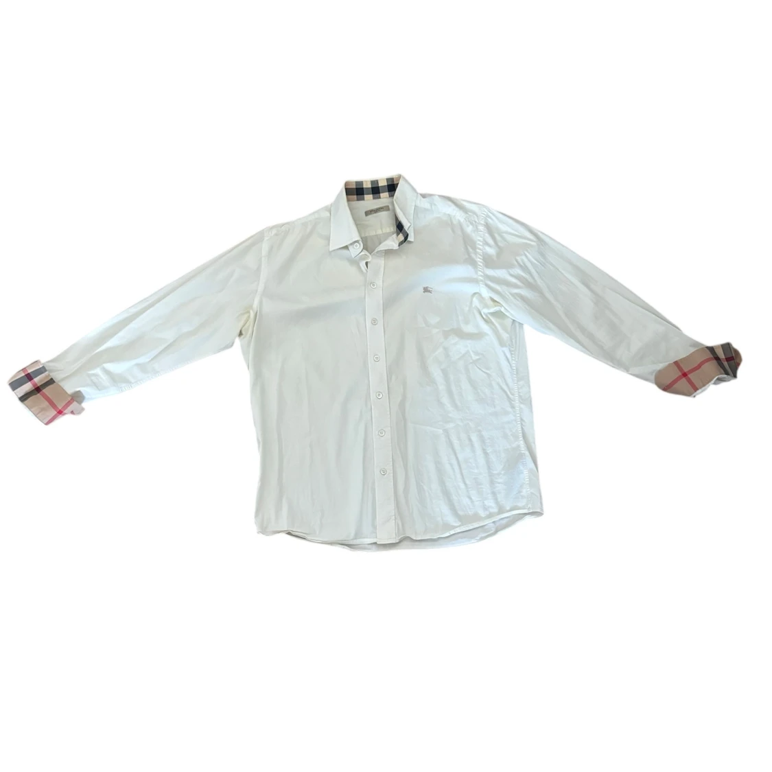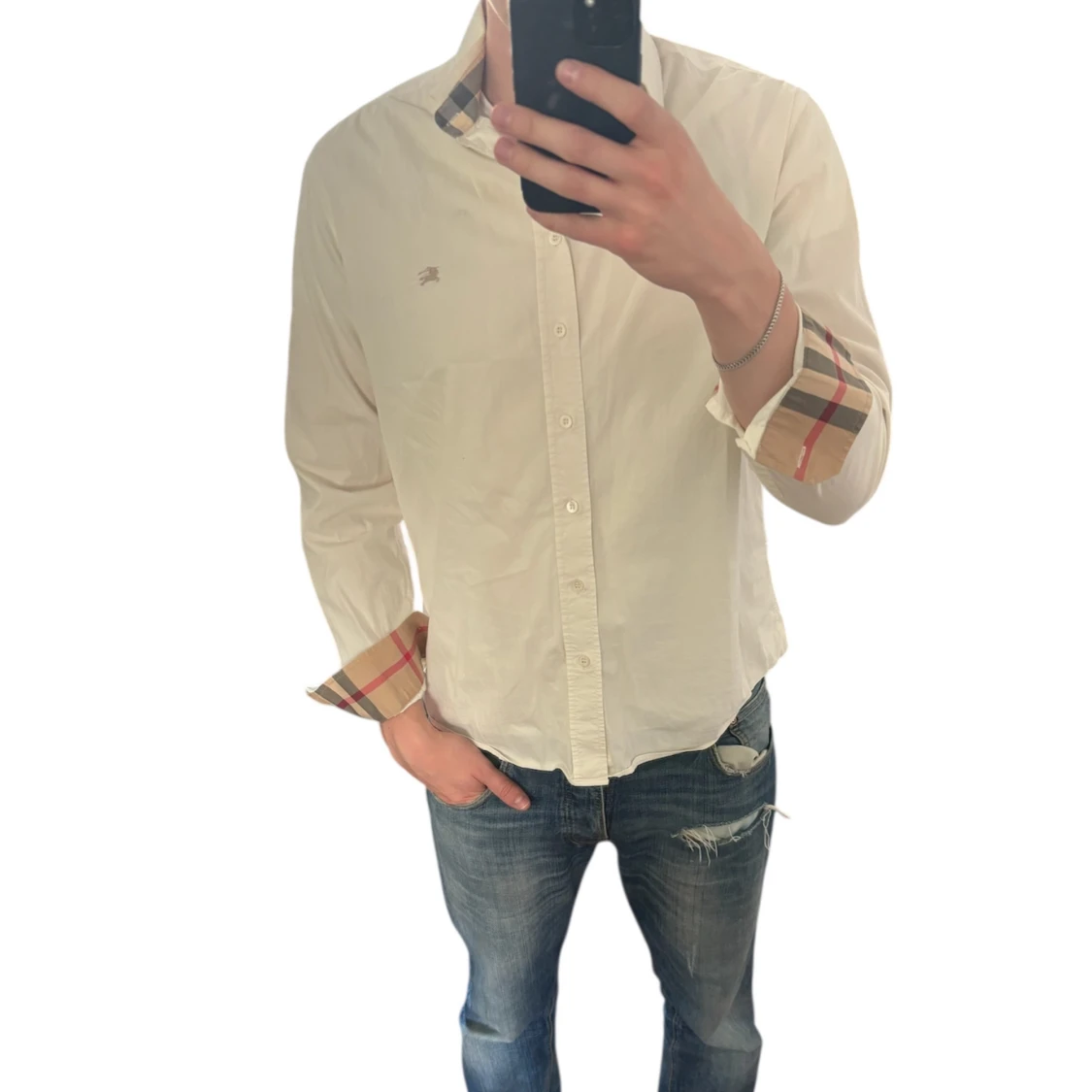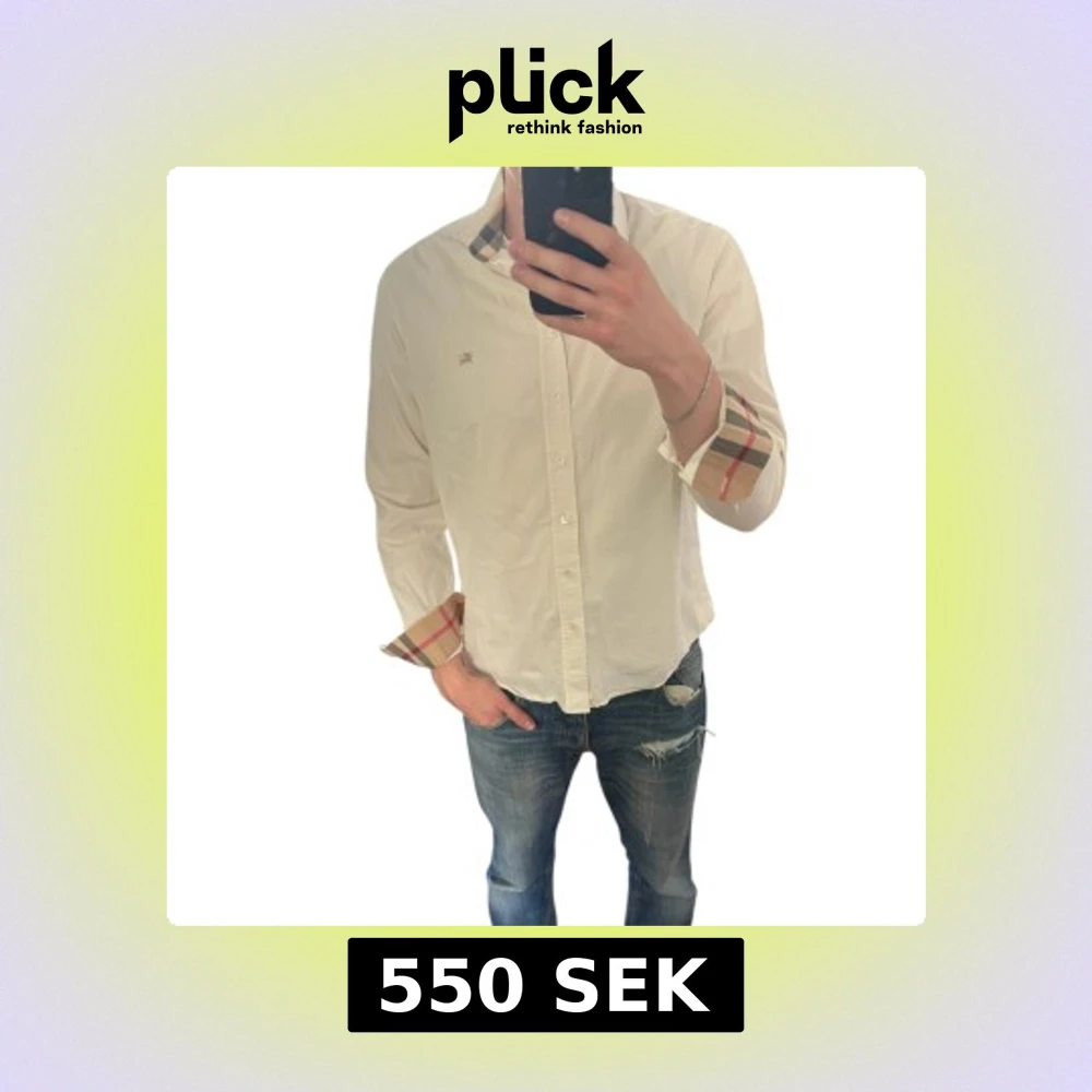 Säljer en klassisk vit skjorta från Burberry med ikoniska rutiga detaljer på krage och ärmslut. Skjortan har knappar framtill och lång ärm, perfekt för en stilren look. Storlek L men passar lite M Är 185cm lång.