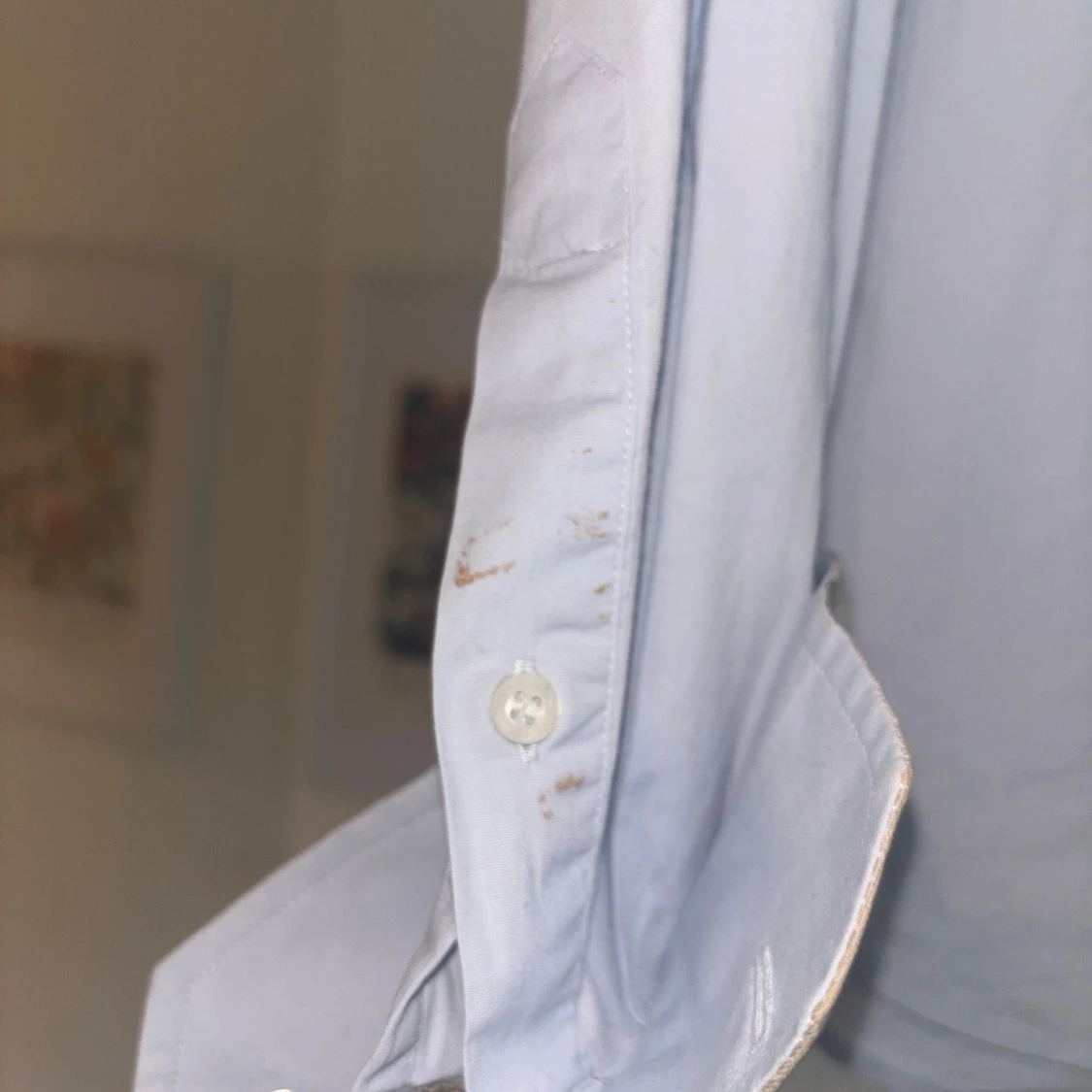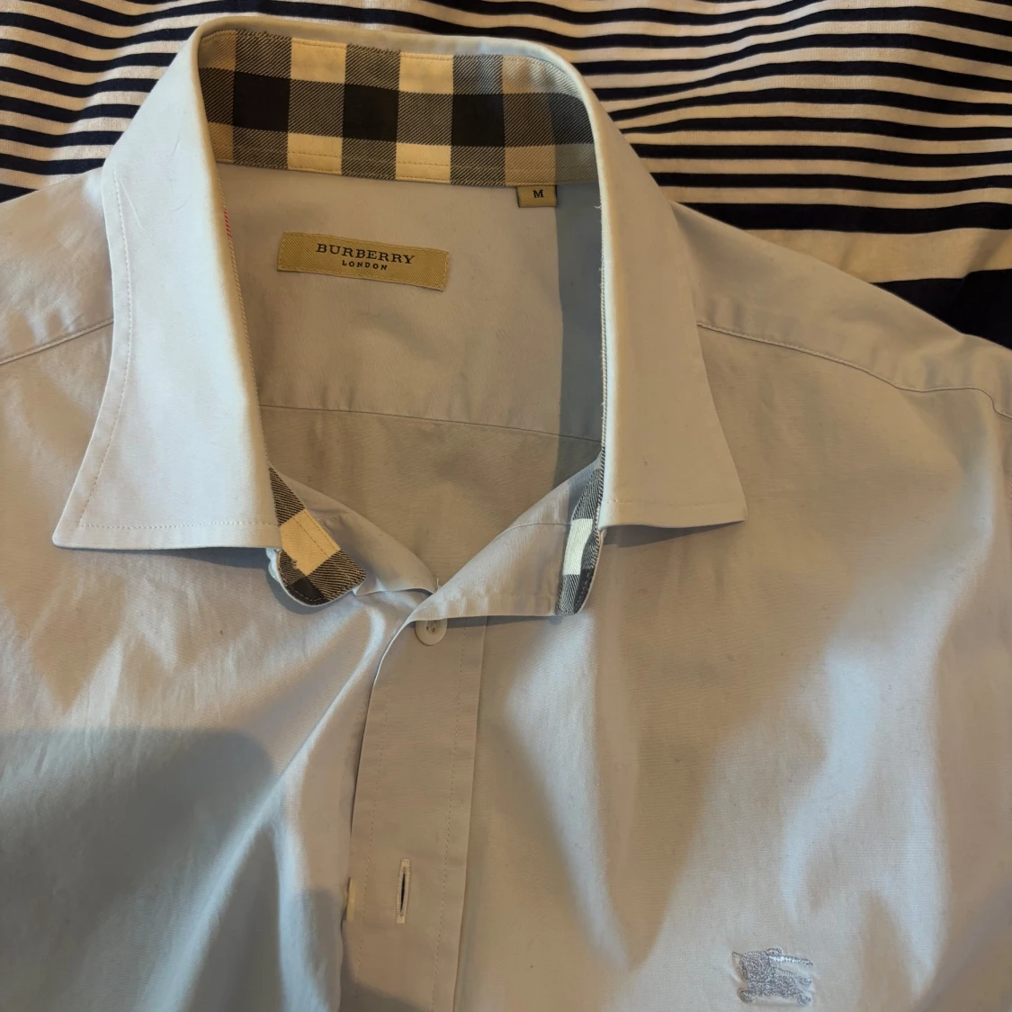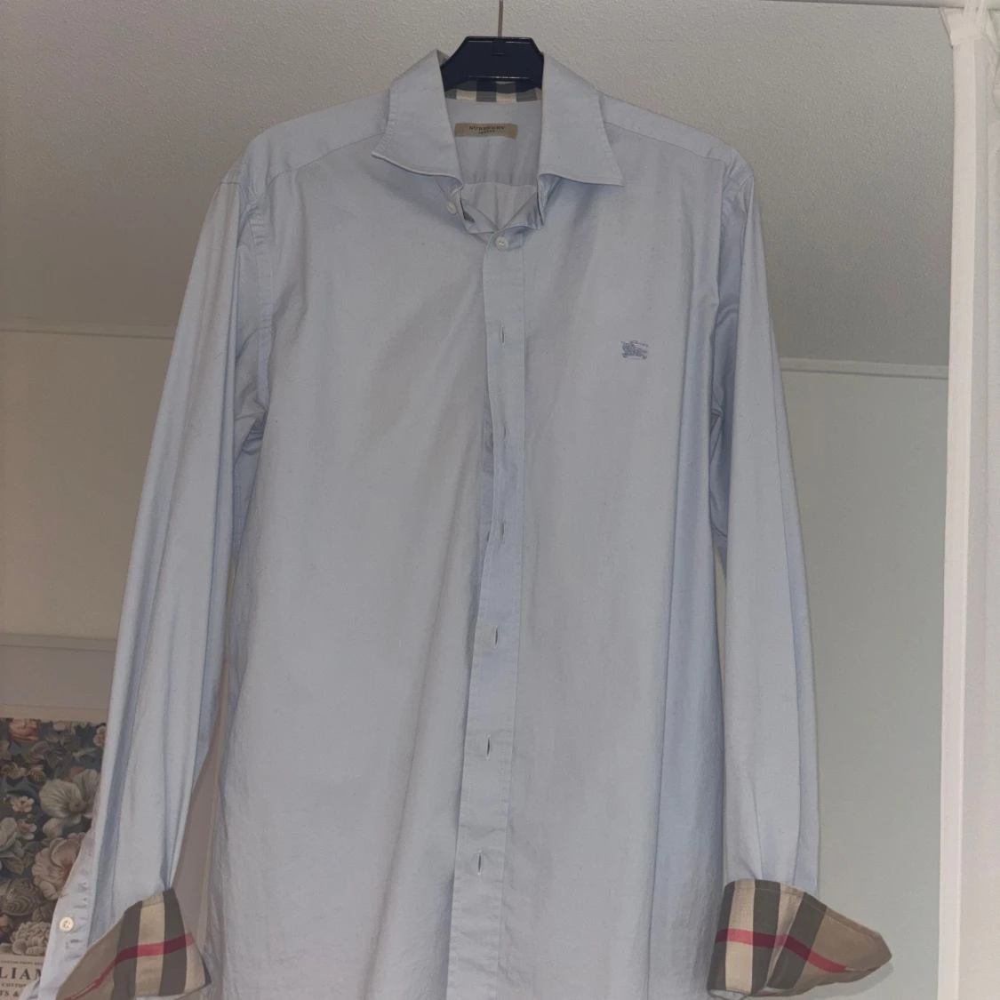 Tja, säljer denna Burberry skjorta i färgen ljusblå & i storlek M. Sparsamt använd, finns en mindre defekt på höger sida arm (syns på sista bilden). Mitt pris ligger på 599kr, priset går att diskutera.