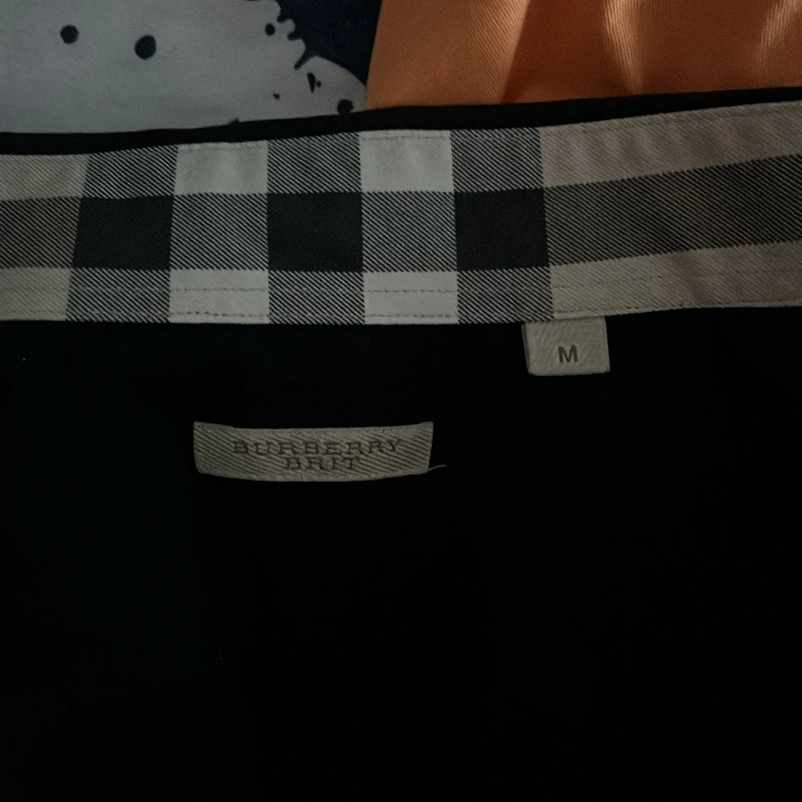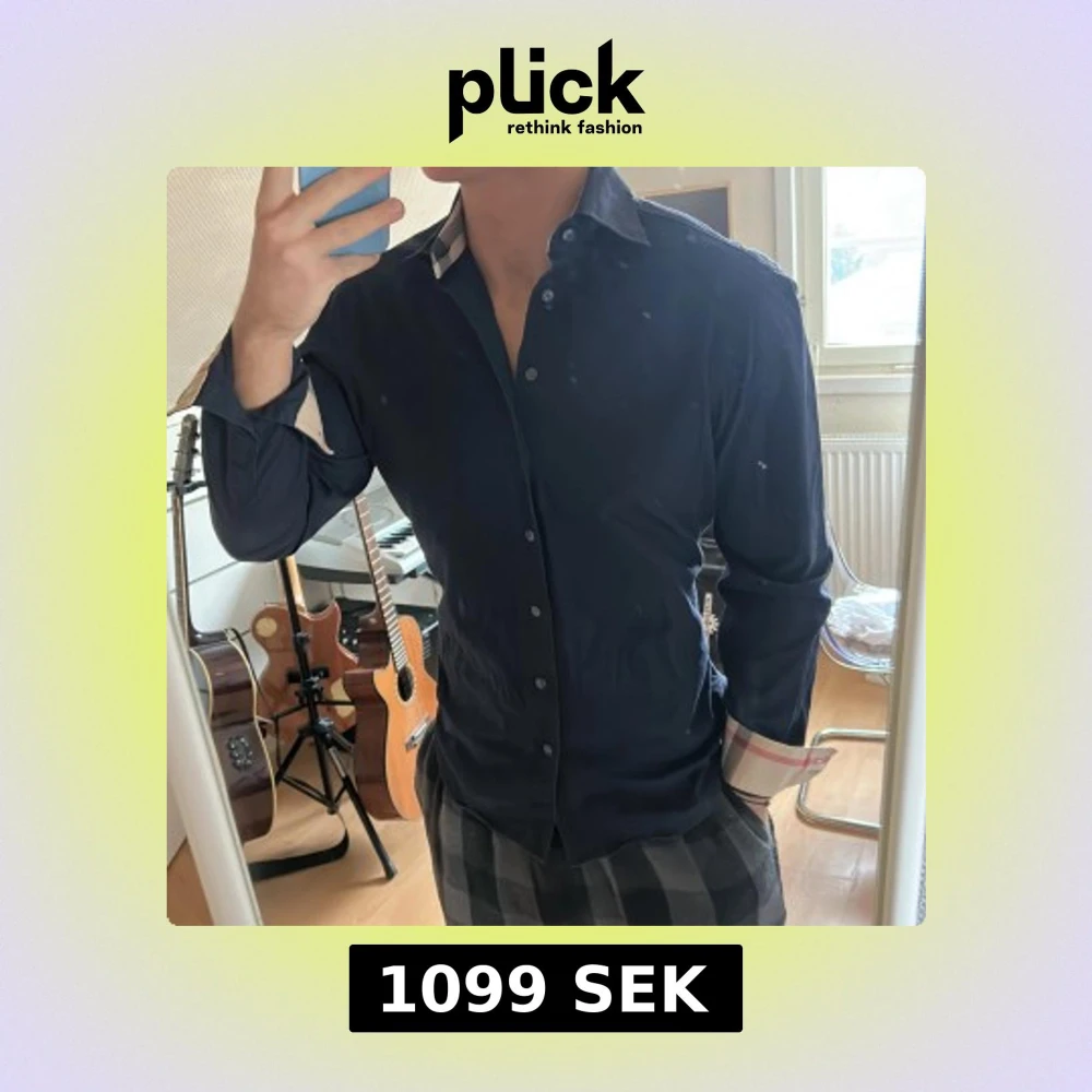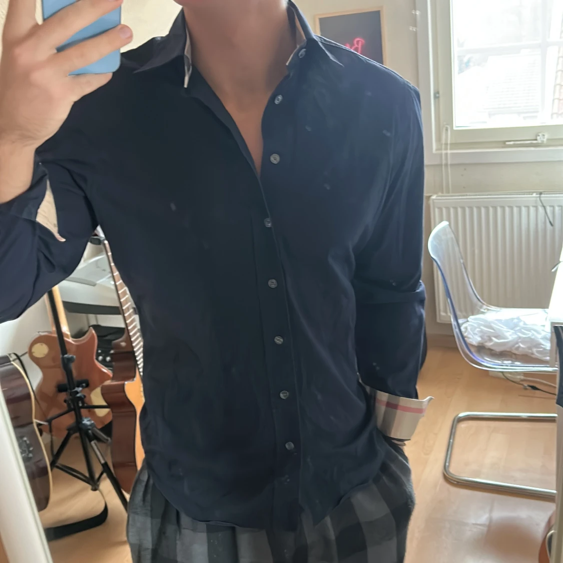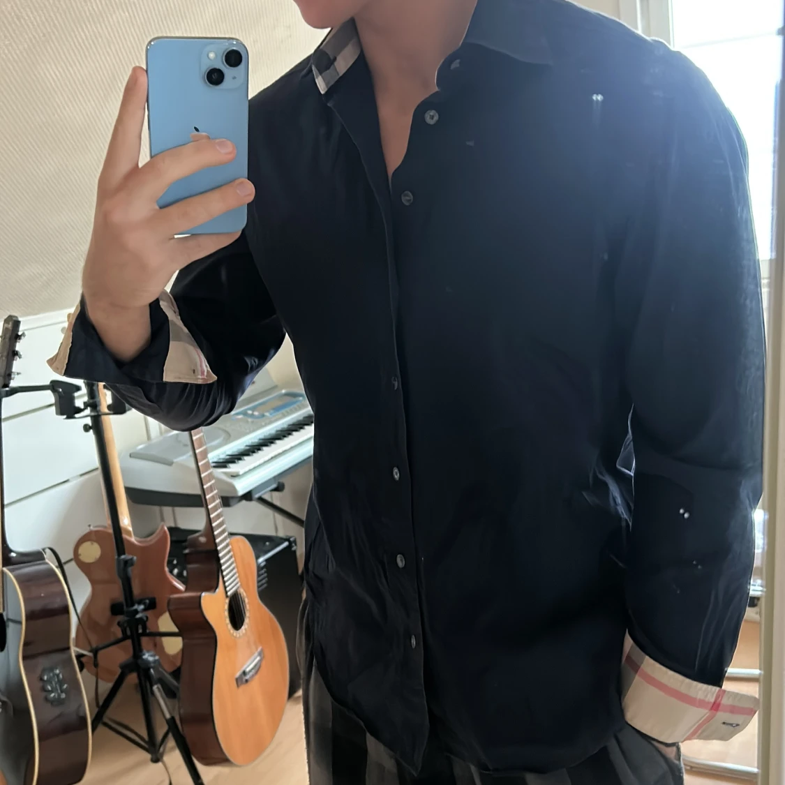 Mörkblå svart skjorta från Burberry med klassiska rutiga detaljer på insidan av kragen och ärmsluten. Skjortan har en stilren design med knappar framtill och långa ärmar. Perfekt för en stilmedveten look.