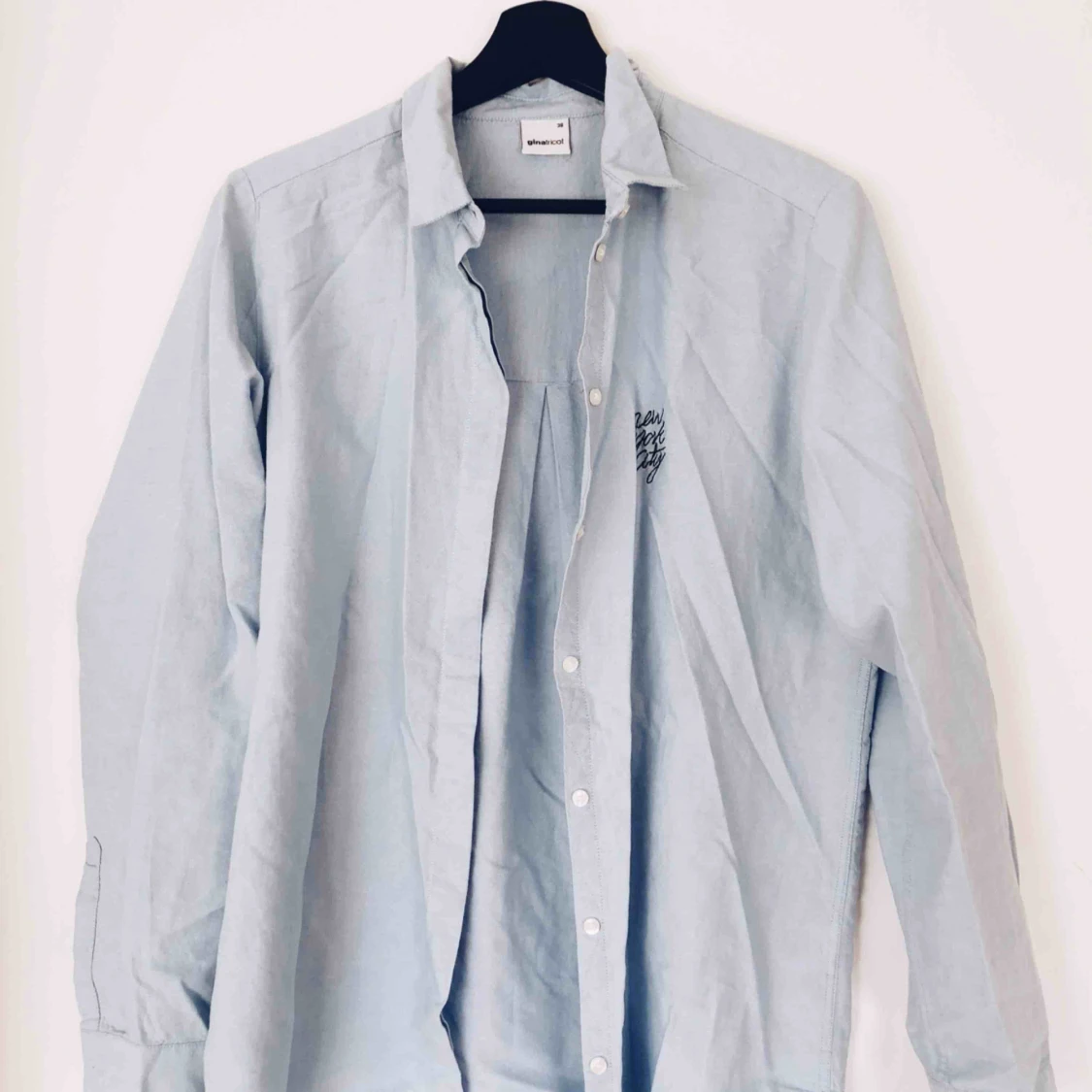 Blå skjorta, lite oversize i modellen. Bör därför passa L också 💫 frakt + 30kr 💘