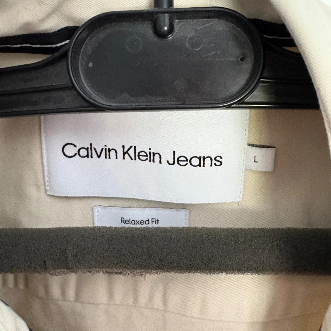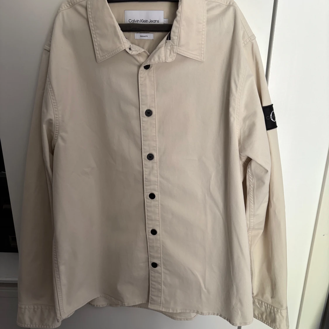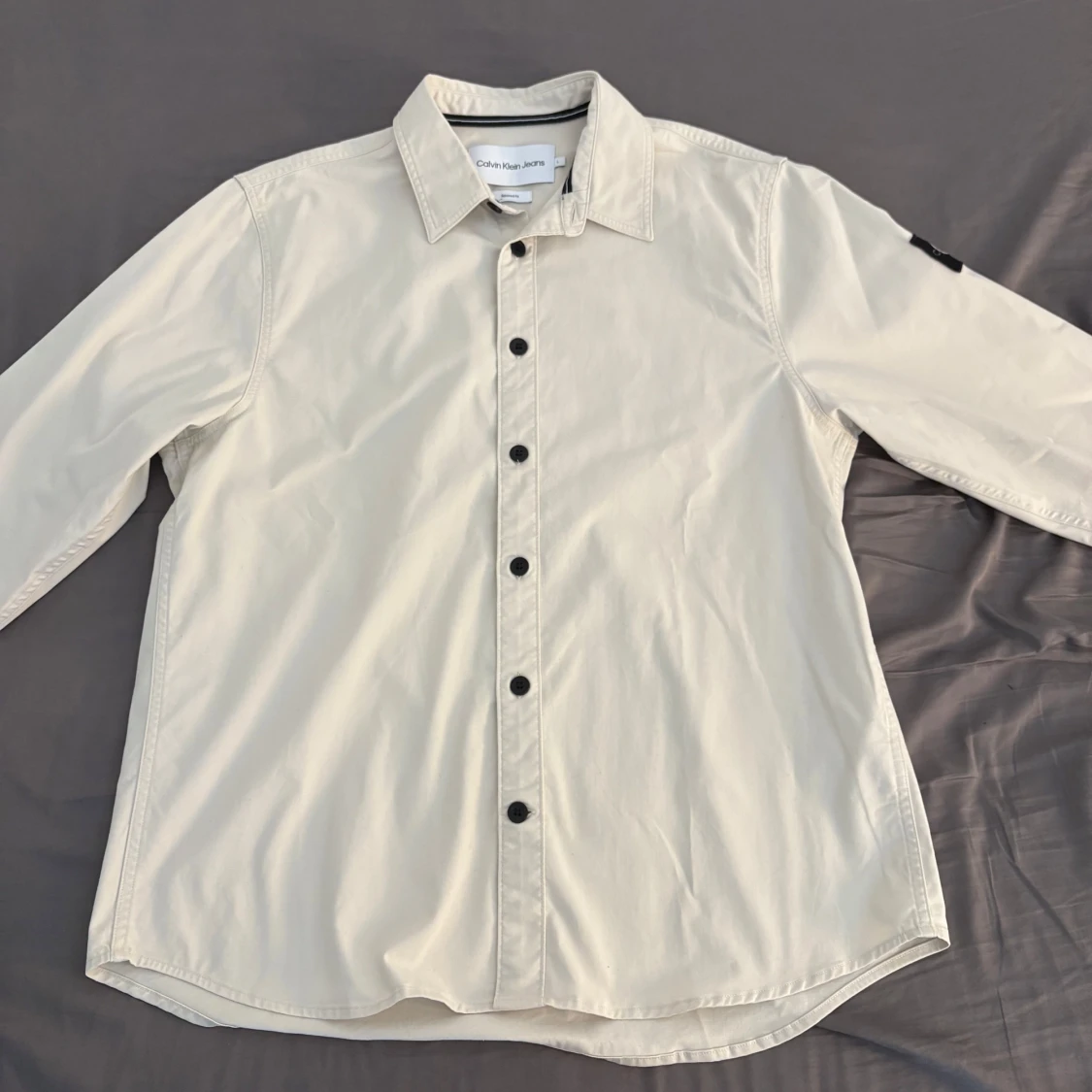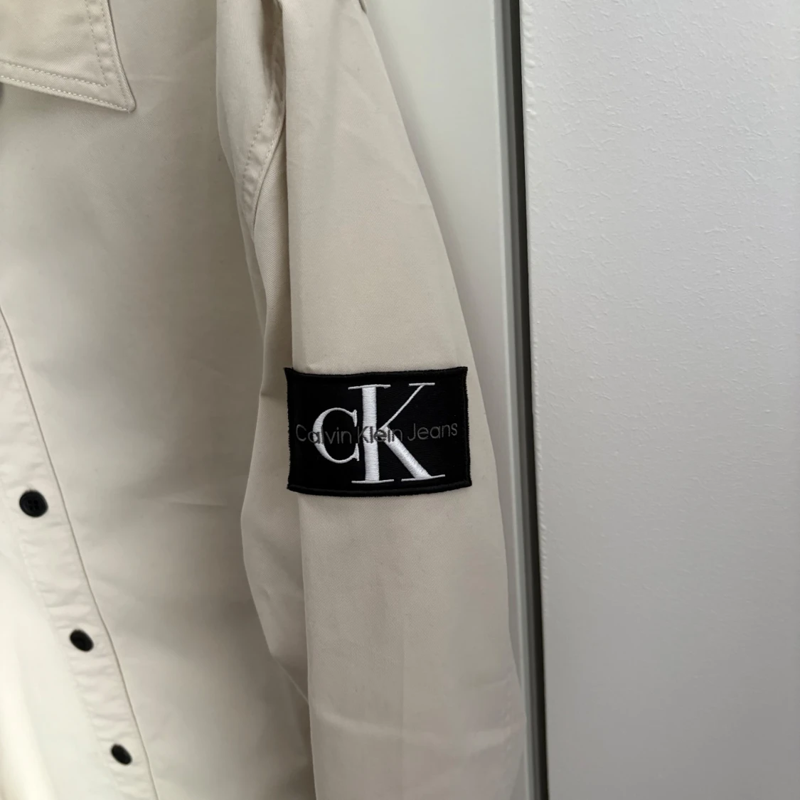 Snygg beige overshirt från Calvin Klein Jeans i bomull med svart CK-logga på ärmen. Rak passform med svarta knappar framtill och klassisk krage. Perfekt för dig som gillar stilrena och enkla plagg med en modern touch.