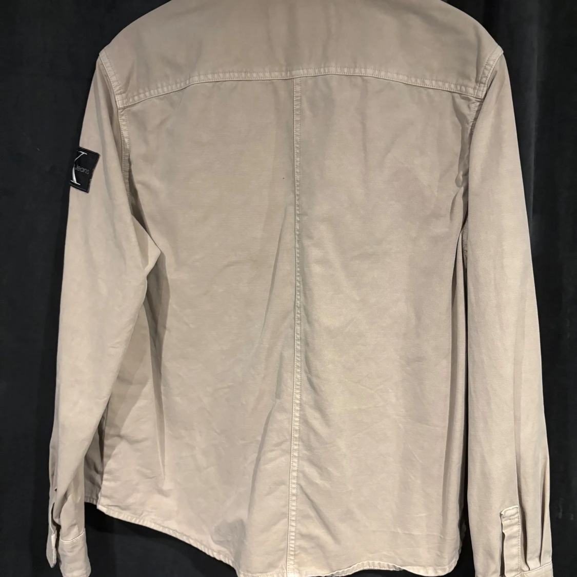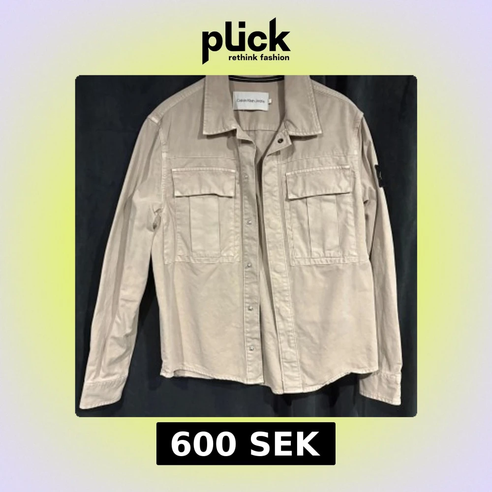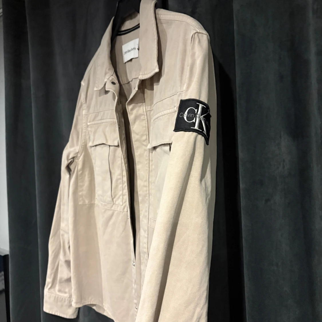 Stilren beige overshirt från Calvin Klein Jeans med klassisk krage, två stora bröstfickor med lock och tryckknappar framtill. Långärmad modell med svart logopatch på ena ärmen. Perfekt lager-på-lager-plagg i mjuk bomull. Aldrig använd då jag råkade köpa den i förliten storlek. Storlek S