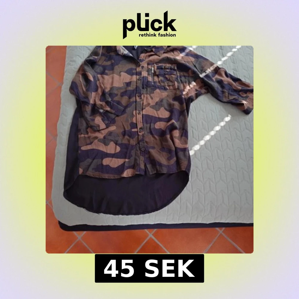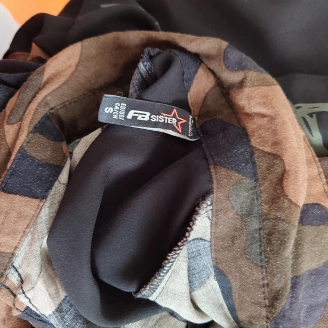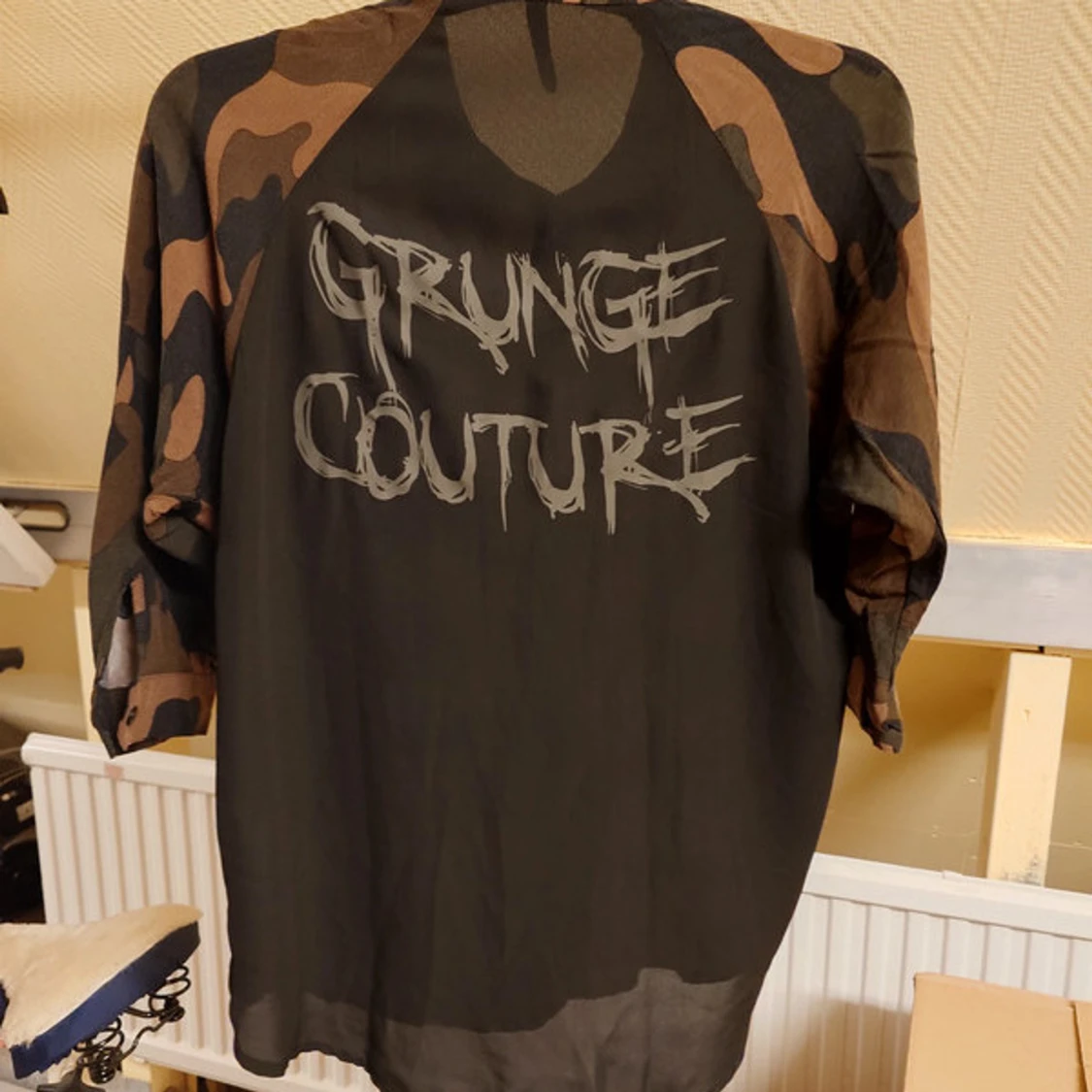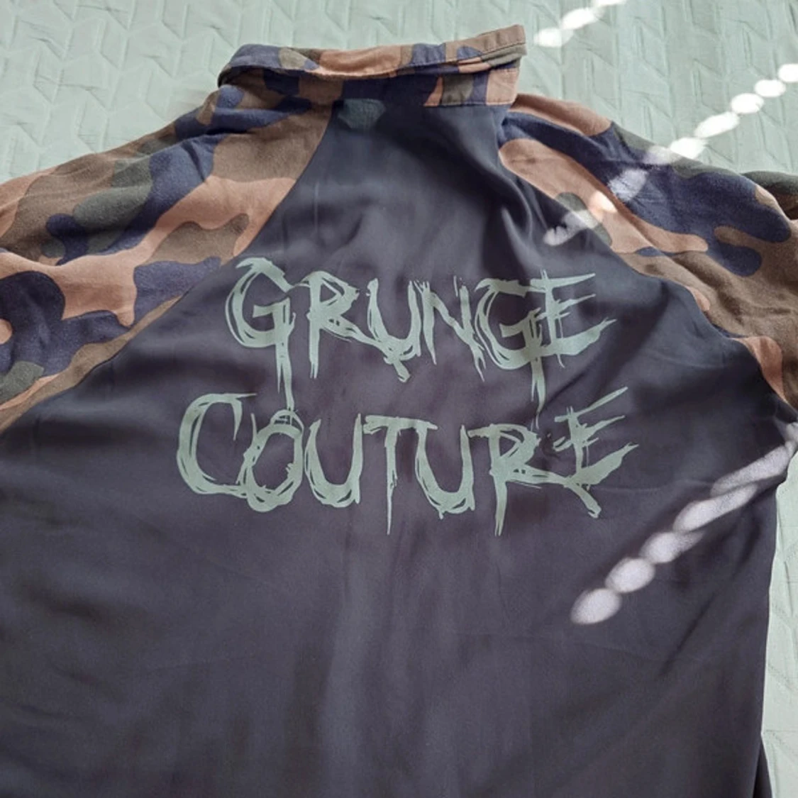 Cool lång skjorta från FB Sister i storlek S med brunt och grönt camouflage-mönster. Baksidan har ett stort tryck med texten 'Grunge Couture'. Skjortan har knappar framtill, bröstficka med dragkedja och lång bakdel. Materialet är lätt och känns som bomull.