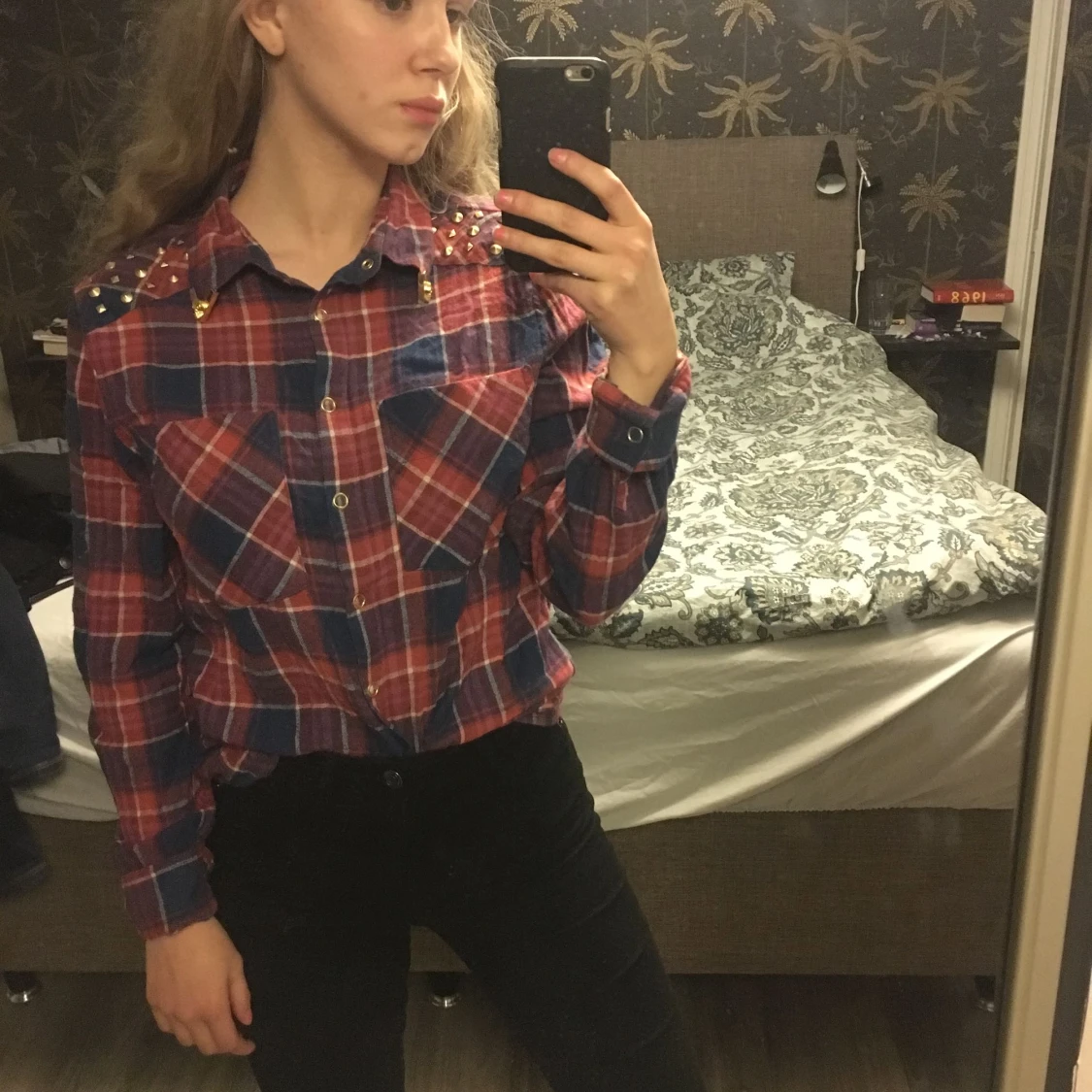 Superskön, rockig skjorta med guldiga nitar. Säljer för att jag inte har användning för den. Kan eventuellt gå ner i pris vid snabb affär. Kan mötas upp i Karlstad eller Arvika. 40kr + frakt.