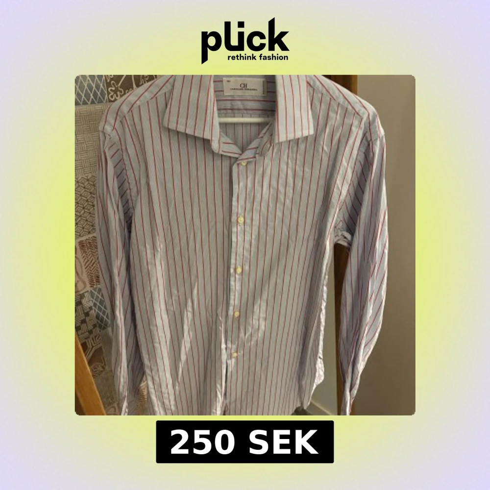Snygg skjorta från Carolina Herrera med tunna röda ränder på vit botten. Klassisk krage, långa ärmar och knappar med logotyp. Tillverkad i Portugal av mjuk bomull. Perfekt för dig som gillar stilrena och tidlösa plagg med en twist. Obs, fläck på andra bilden som går att få bort med fläckborttagningsmedel eller galltvål.
