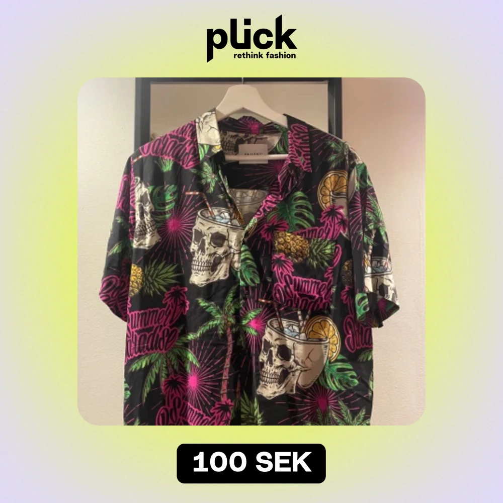 Cool Hawaiiskjorta med dödskallar och palmer pĂ„đŽâ ïž Perfekt för hĂ€rliga sommarkvĂ€llar! AnvĂ€nd bara en gĂ„ng.