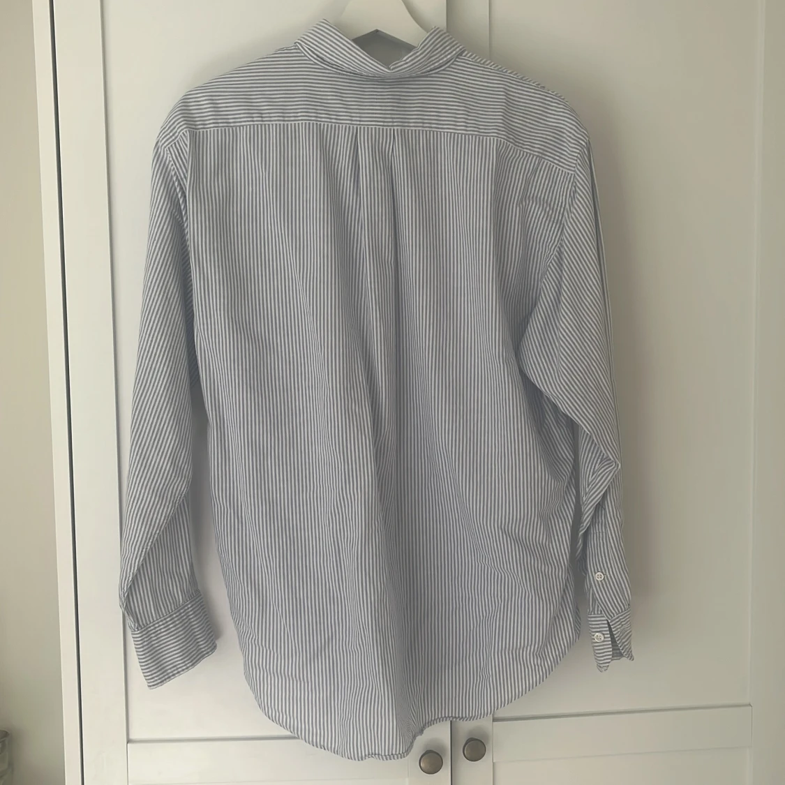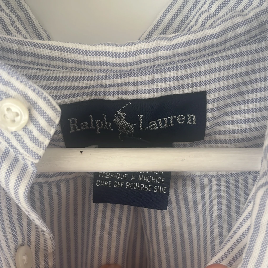 Buda gärna! Klassisk skjorta från Ralph Lauren i vitt och blått med tunna ränder. Skjortan har lång ärm, knappar framtill och broderad logga på bröstet. Tillverkad i mjuk bomull och har en tidlös, normal passform. Perfekt för en clean och stilren look. Stlk 10 vilket motsvarar Large eller EU 40. Perfekt skick!