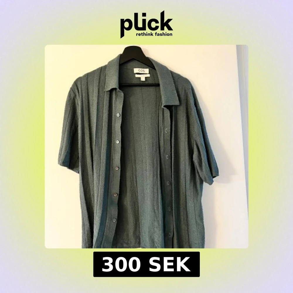 Säljer en grå skjorta från COS i relaxed fit med kort ärm och knappar framtill. Skjortan har ett ribbat mönster och är tillverkad i ett mjukt, texturerat material som ger en chill och modern vibe. Perfekt för dig som gillar en loose och avslappnad stil.