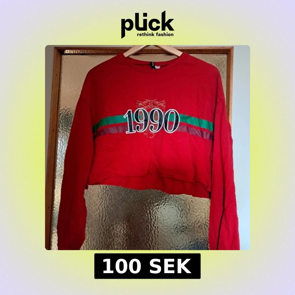Cool röd croppad tröja från H&M med trycket '1990' framtill och gröna samt vinröda ränder över bröstet. Långärmad modell med avslappnad passform, perfekt till jeans eller kjol för en retro vibe. Jätte fint skick:)