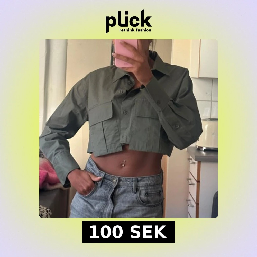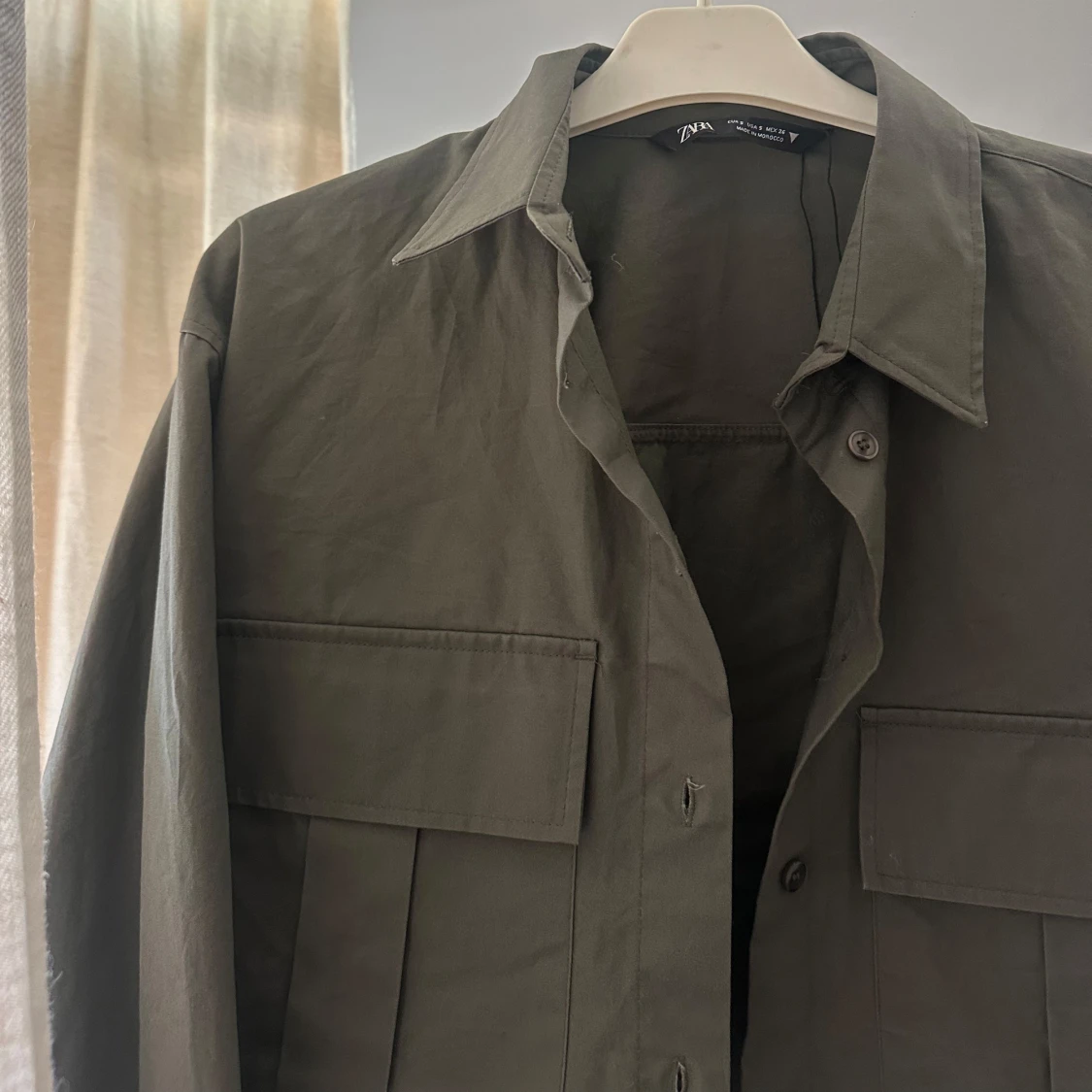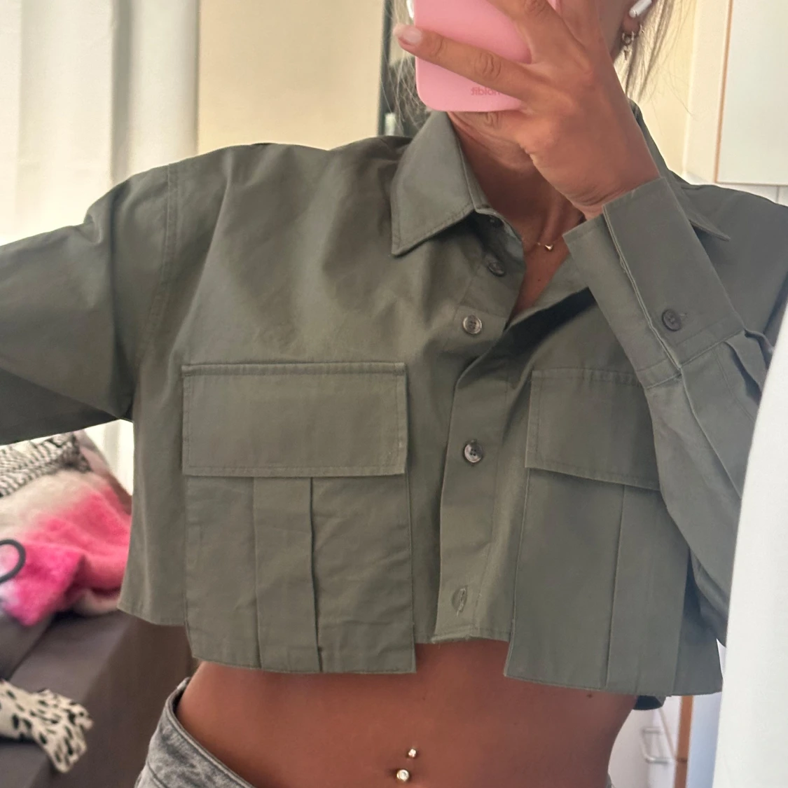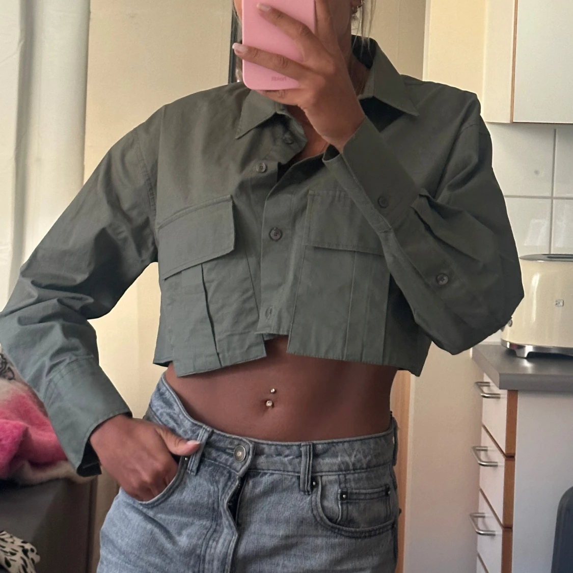 Snygg croppad skjorta från Zara i militärgrönt. Skjortan har stora bröstfickor, klassisk krage och knäppning framtill. Tillverkad i bomull och har långa ärmar.