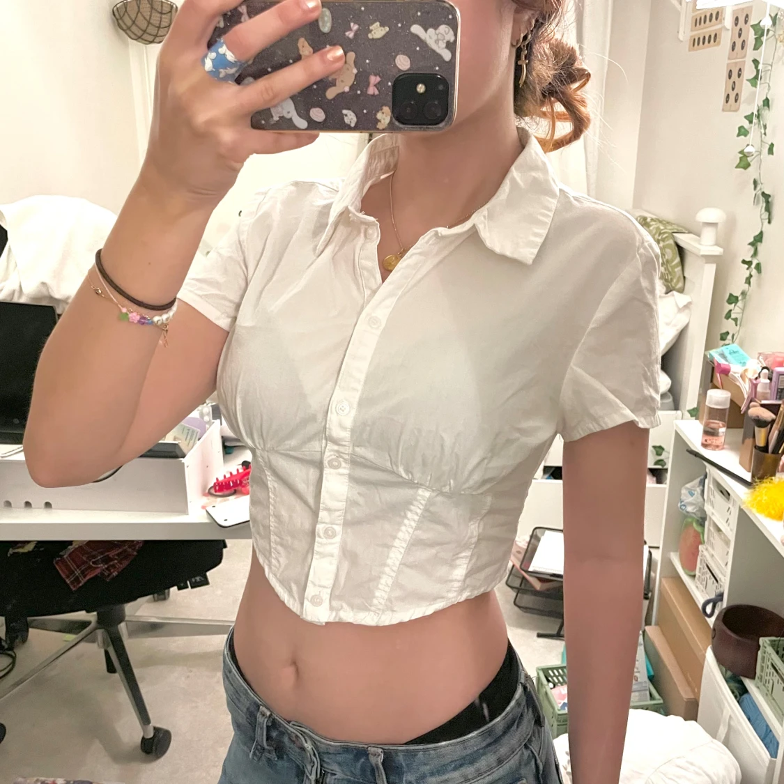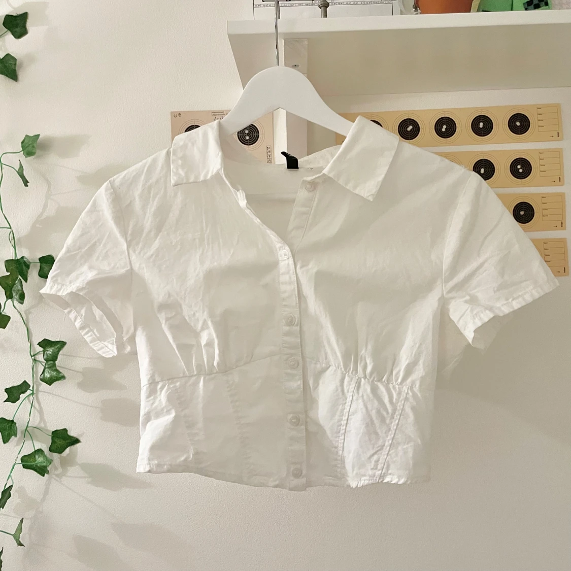 Vit croppad skjorta från H&M med snygg figurnära passform. Tillverkad i 100% bomull, jättefint skick! 🤍Kolla gärna in mina andra annonser, försöker bli av med allt så snart som möjligt 💝pris alltid förhandlingsbart, brukar gå med på de flesta prisförslag!😚