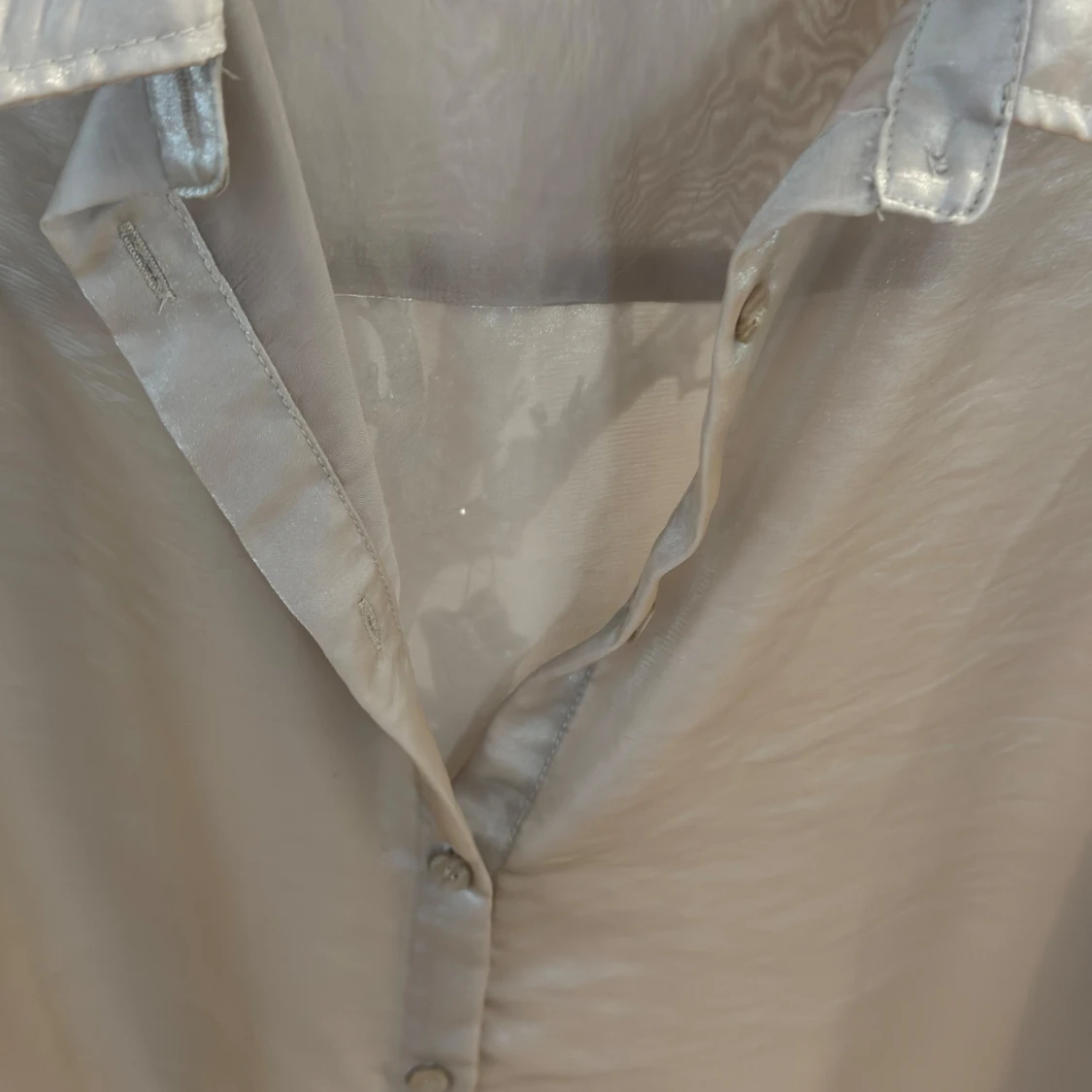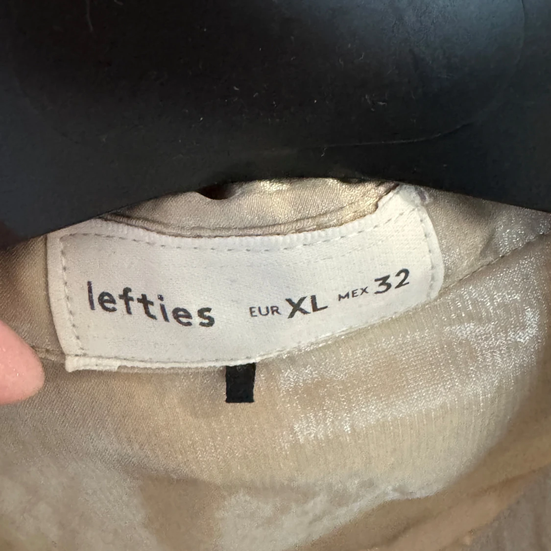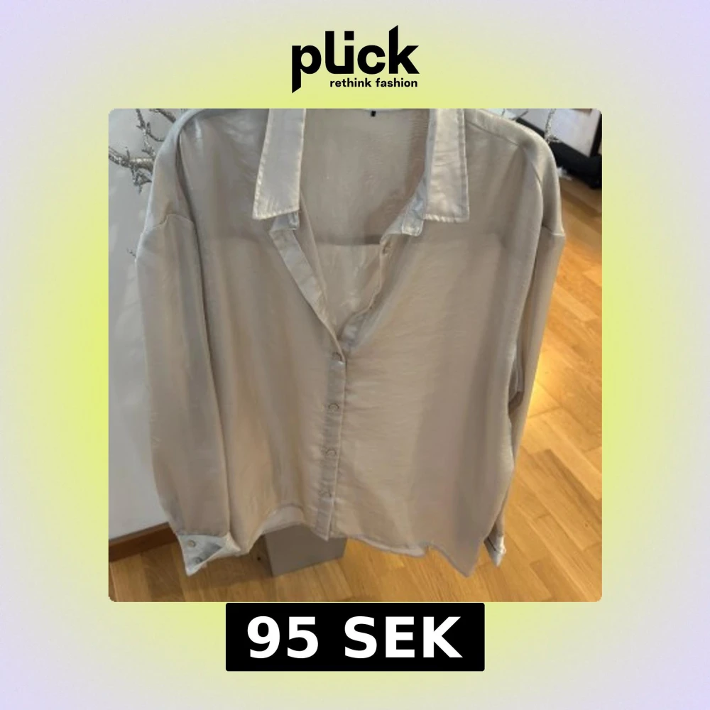 Säljer en stilren beige blus i satin från Lefties. Blusen har klassisk krage, knäppning framtill och långa ärmar med knapp vid ärmslut. Perfekt för dig som gillar en elegant och enkel look.