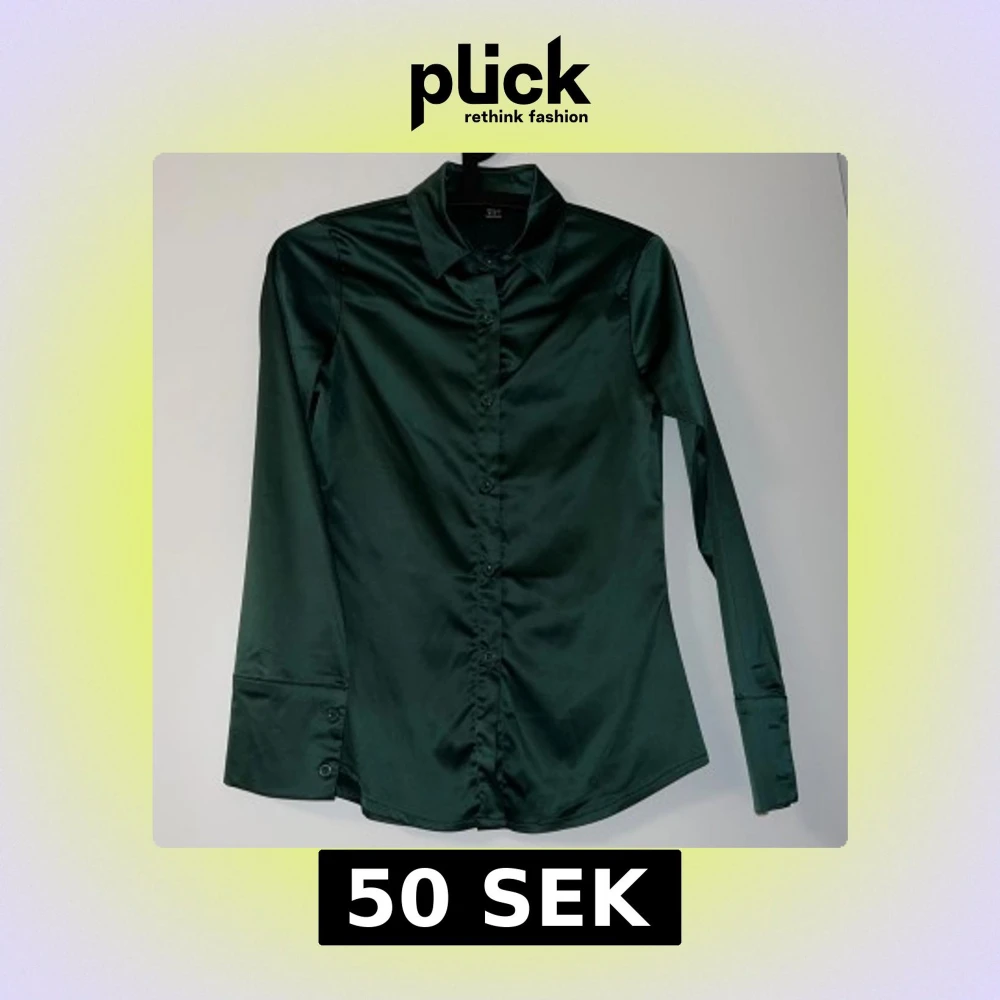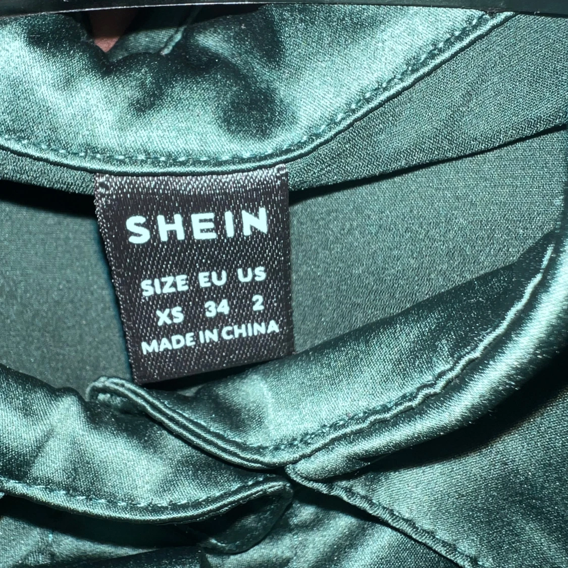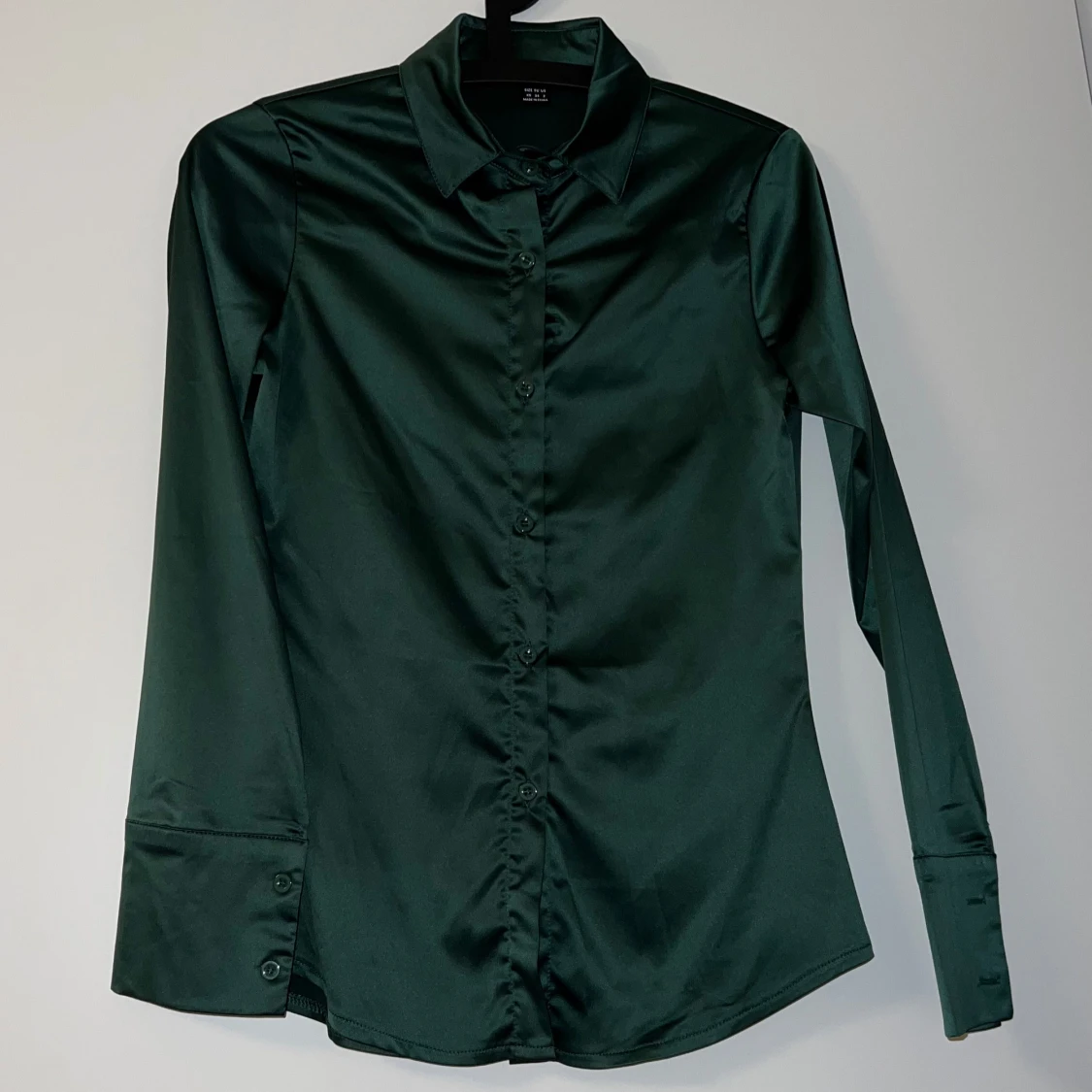 Elegant grön satinblus från Shein med långa ärmar och knappar framtill. Perfekt för en stilren look.