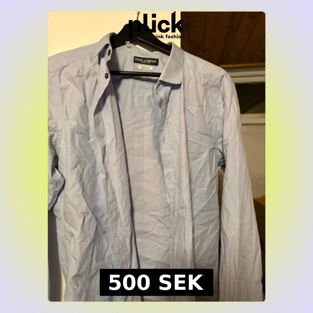 Säljer en stilren ljusblå skjorta från Dolce & Gabbana Gold. Skjortan har klassisk krage, långa ärmar och knappar framtill. Tillverkad i mjuk bomull som känns skön mot huden. Perfekt för dig som vill ha en clean och snygg look.